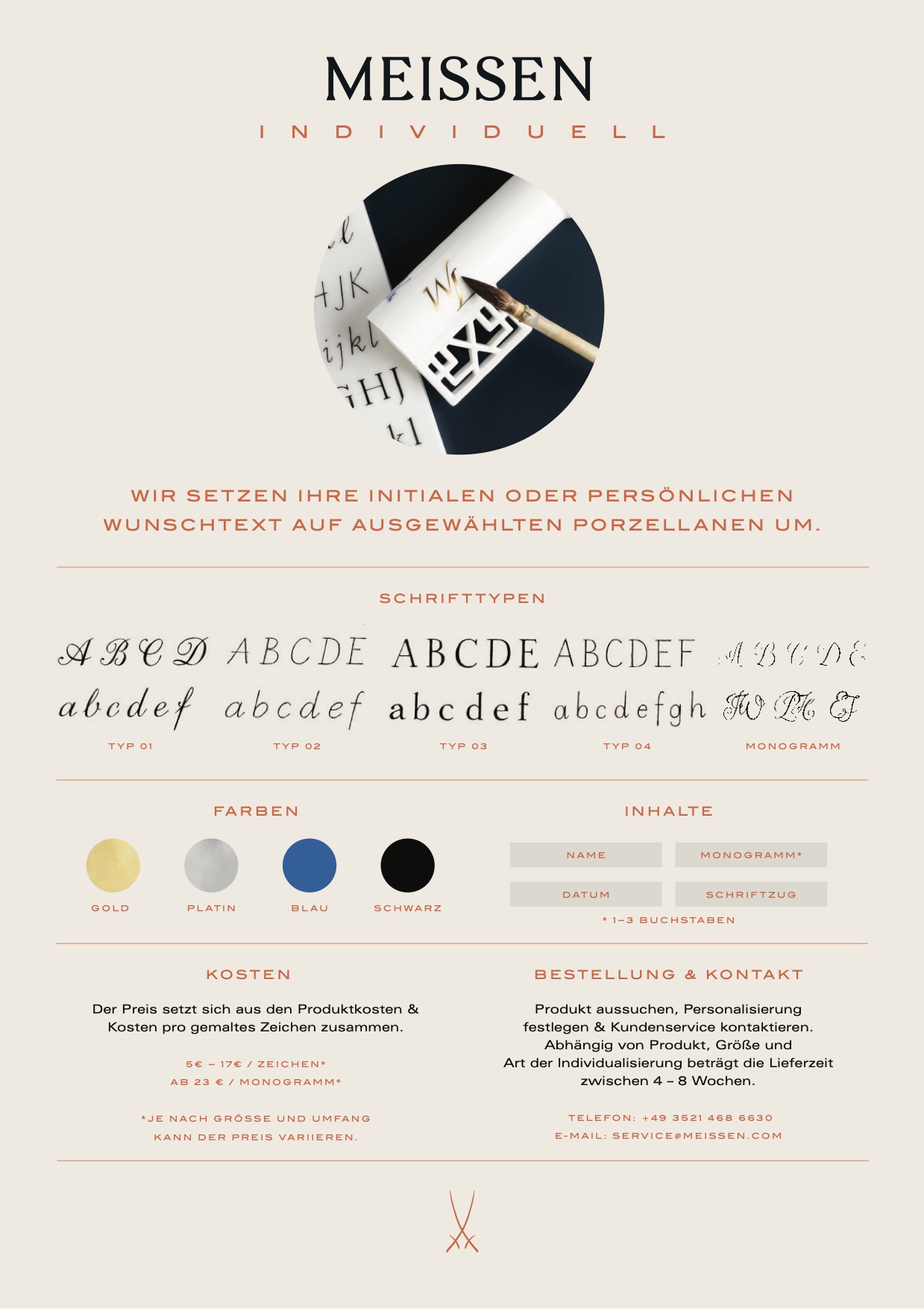 Besteht die Möglichkeit von Sonderanfertigungen (z.B. Monogrammen oder Porträts) auf Meissener Porzellan? Was kosten diese und wie lange ist die Lieferzeit?
