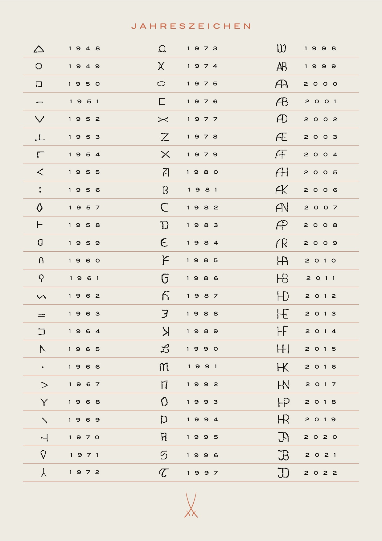 Neben unserem Markenzeichen, den Gekreuzten Schwertern, finden Sie verschiedene Zahlen und Zeichen auf der Bodenseite Ihrer Porzellanstücke. Diese können folgende sein: