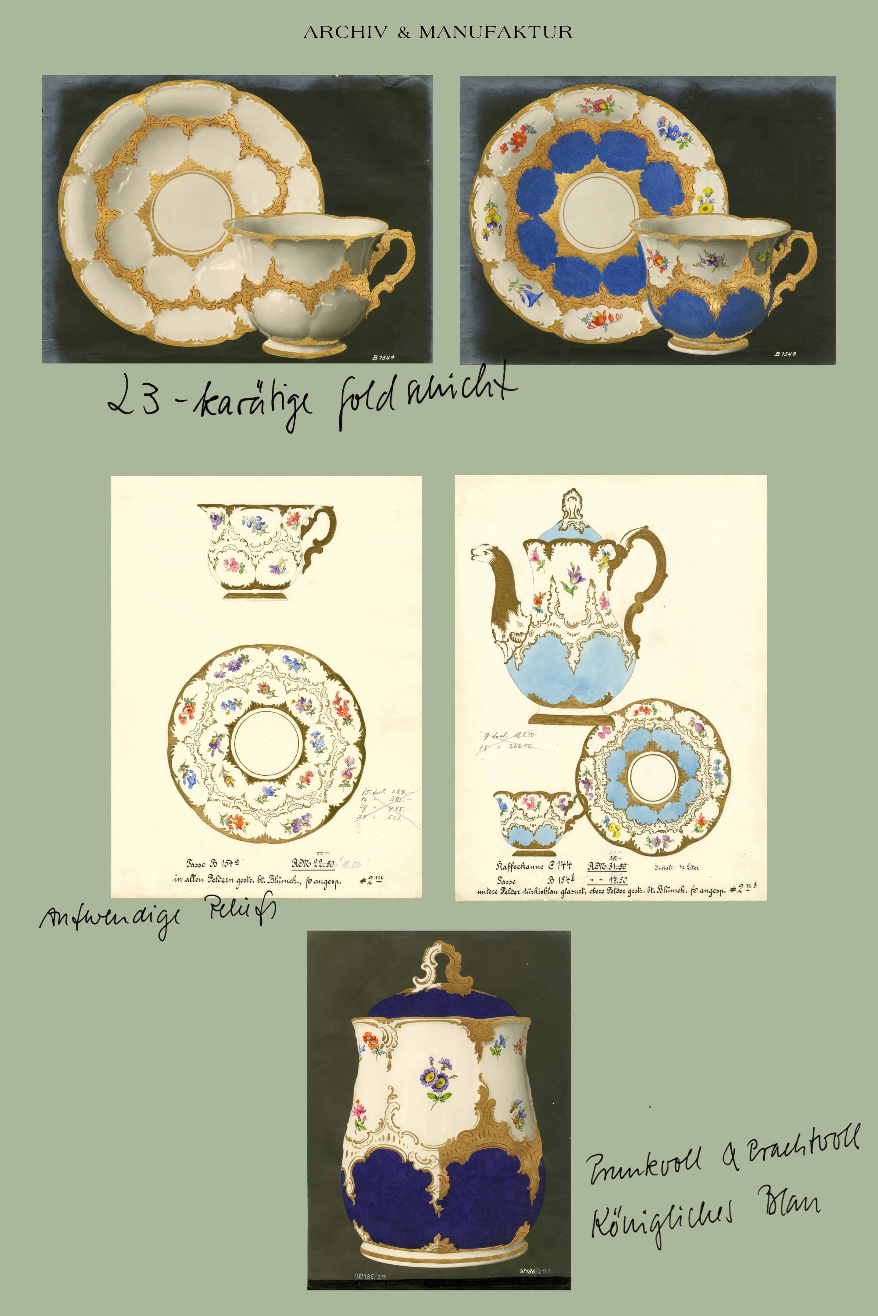 „Königliches Blau, aufwändige Reliefs mit 23-karätiger Goldschicht prachtvoll überzogen – das ‚B-Form‘ Service ist ein Meisterstück europäischer Tafelkultur.“