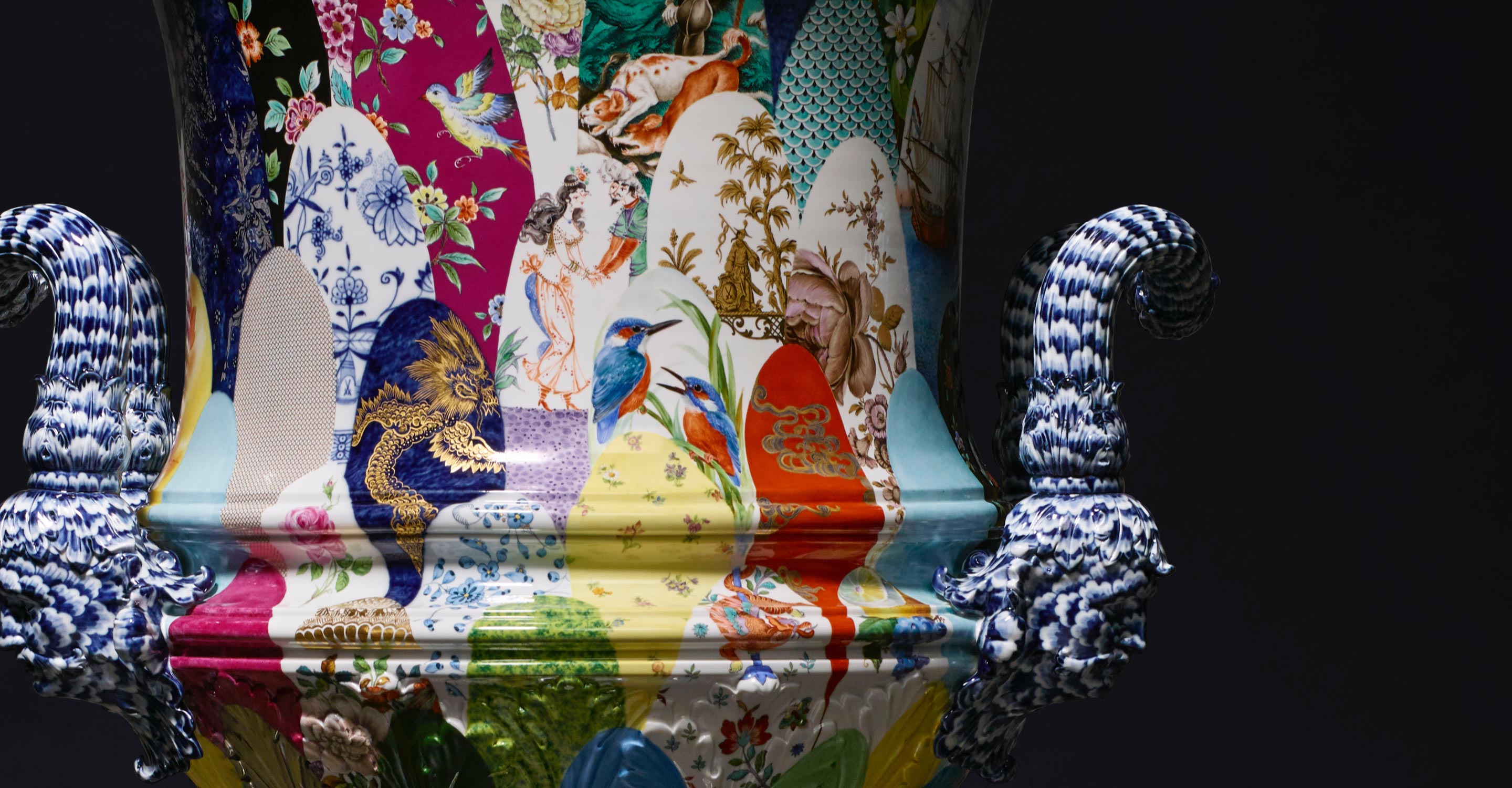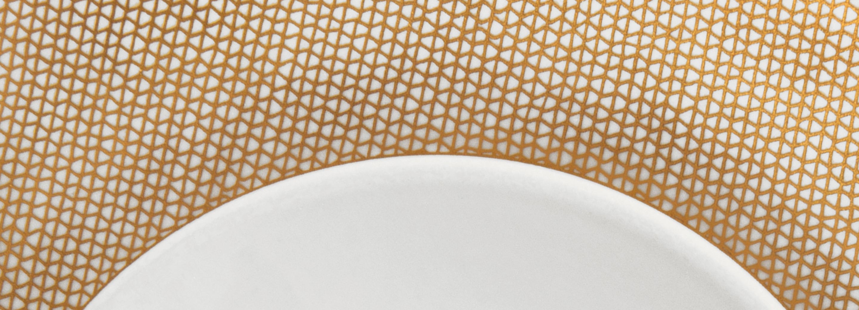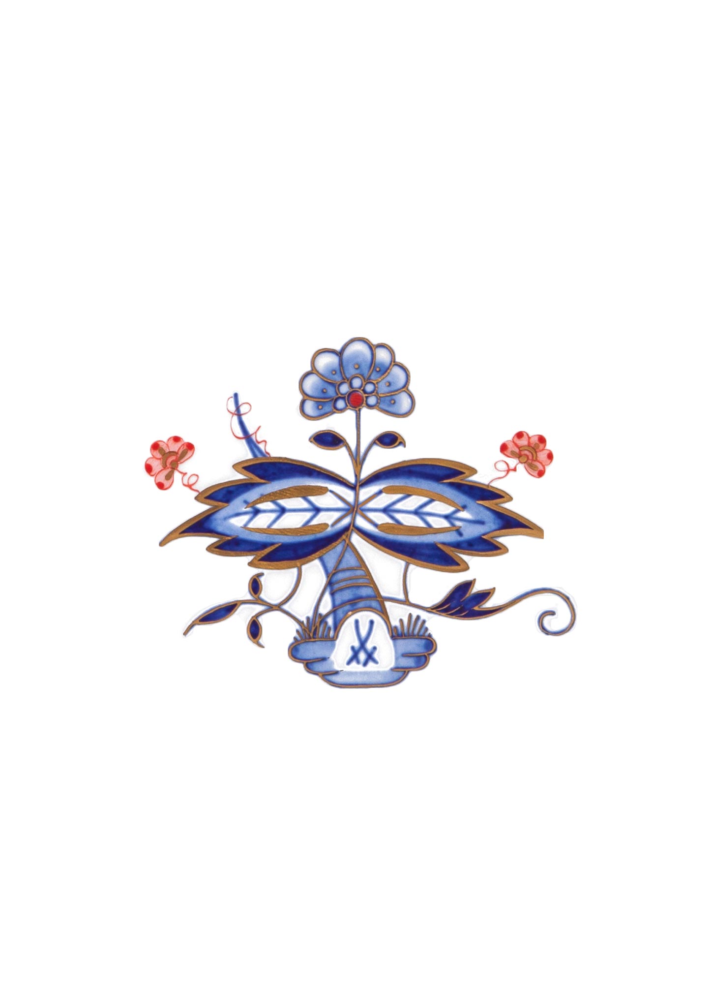 Noble BlueInspiriert von damals überwiegend blau gestalteten ostasiatischen Porzellanen entsteht 1731 in Meissen das weltbekannte „Zwiebelmuster”, der ikonischste Blaudekor der Porzellangeschichte. Tatsächlich stellt der Dekor keine Zwiebeln dar, sondern zeigt in Anlehnung an seine Vorbilder Pfirsich und Melone auf dem Tellerrand sowie Bambusstock und die zarten Blüten der Chrysantheme in der Mitte. In “Noble Blue” findet das „Zwiebelmuster” eine neue Gestalt, die der Opulenz des Originaldekors moderne Leichtigkeit entgegensetzt. Charakteristisch für den Dekor ist die Verwendung des manufaktureigenen Kobaltblaus. Motivische Details in leuchtendem Rot sowie filigrane Goldveredelungen ergänzen schließlich die Farbpalette von „Noble Blue“ und inszenieren das Blau in komplementären Kontrasten.