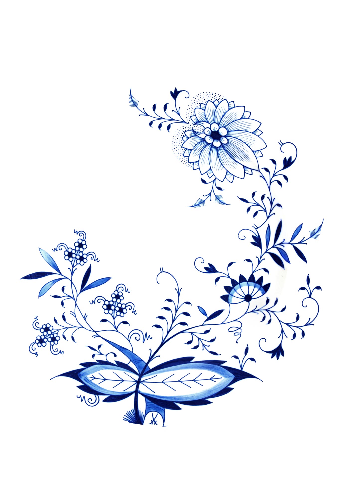 Die Geschichte des „Zwiebelmuster“ ist eingebettet in die Entwicklung der Meissener Blaumalerei und ihrer besonderen ästhetischen Wirkung auf Porzellan. Bereits unmittelbar nach Gründung der Manufaktur beginnt die Suche nach einem ganz besonderen Blau, welches das Weiß des Porzellans hervorheben, gleichzeitig mit ihm harmonieren soll. Die Verbindung der Elemente Kobalt und Sauerstoff erweist sich nach langen Versuchsreihen schließlich als sehr hitzebeständig und optimal geeignet für Porzellan mit hohen Brenntemperaturen. Inspiriert von damals überwiegend blau gestalteten ostasiatischen Dekoren entsteht so um 1731 das strahlend blaue, heute weltberühmte Meissener „Zwiebelmuster“. Tatsächlich stellt es keine Zwiebeln dar, sondern zeigt – in Anlehnung an seine Vorbilder – Pfirsich und Melone auf dem Tellerrand sowie Bambusstock und die zarten Blüten der Chrysantheme in der Mitte.