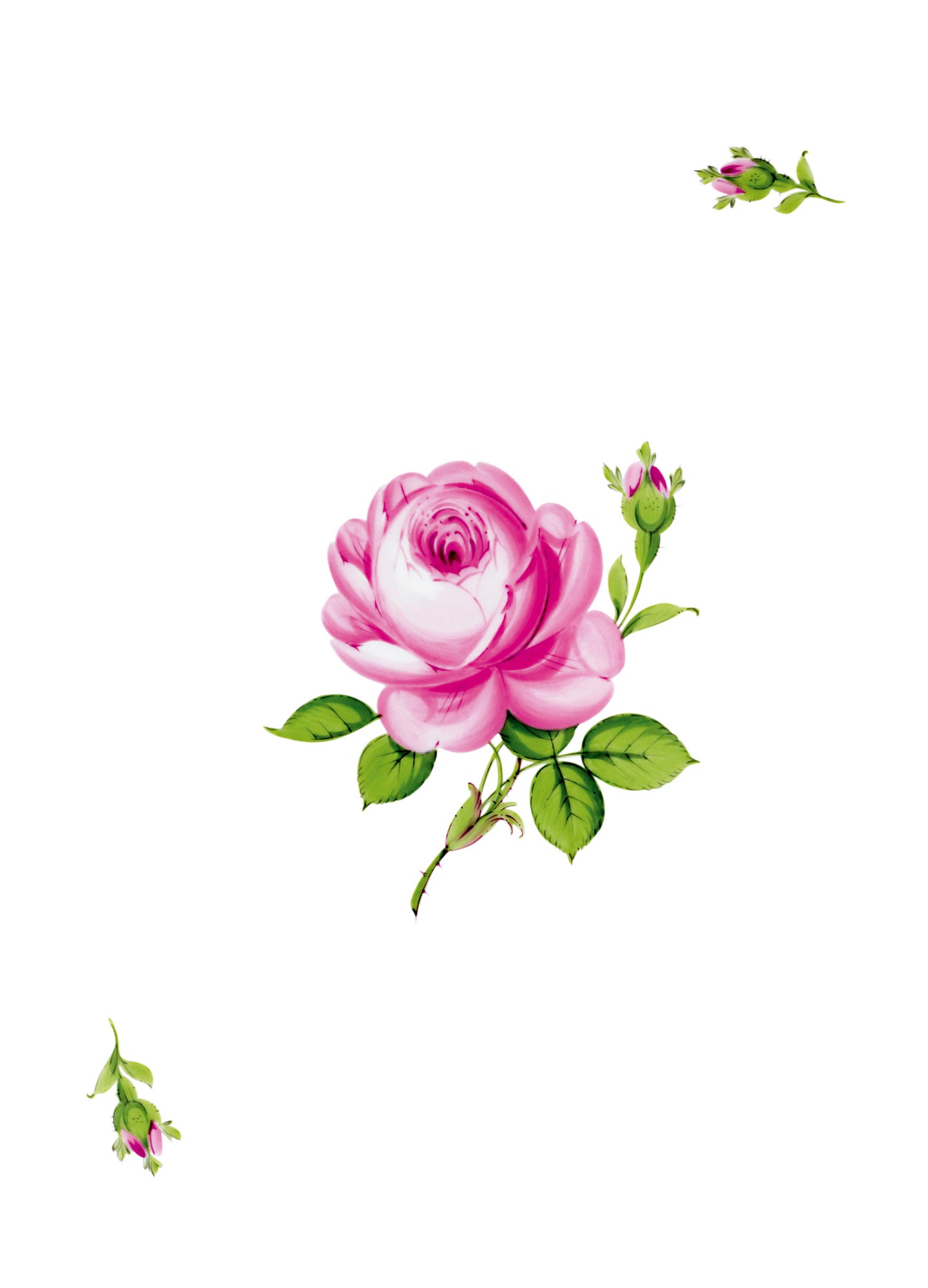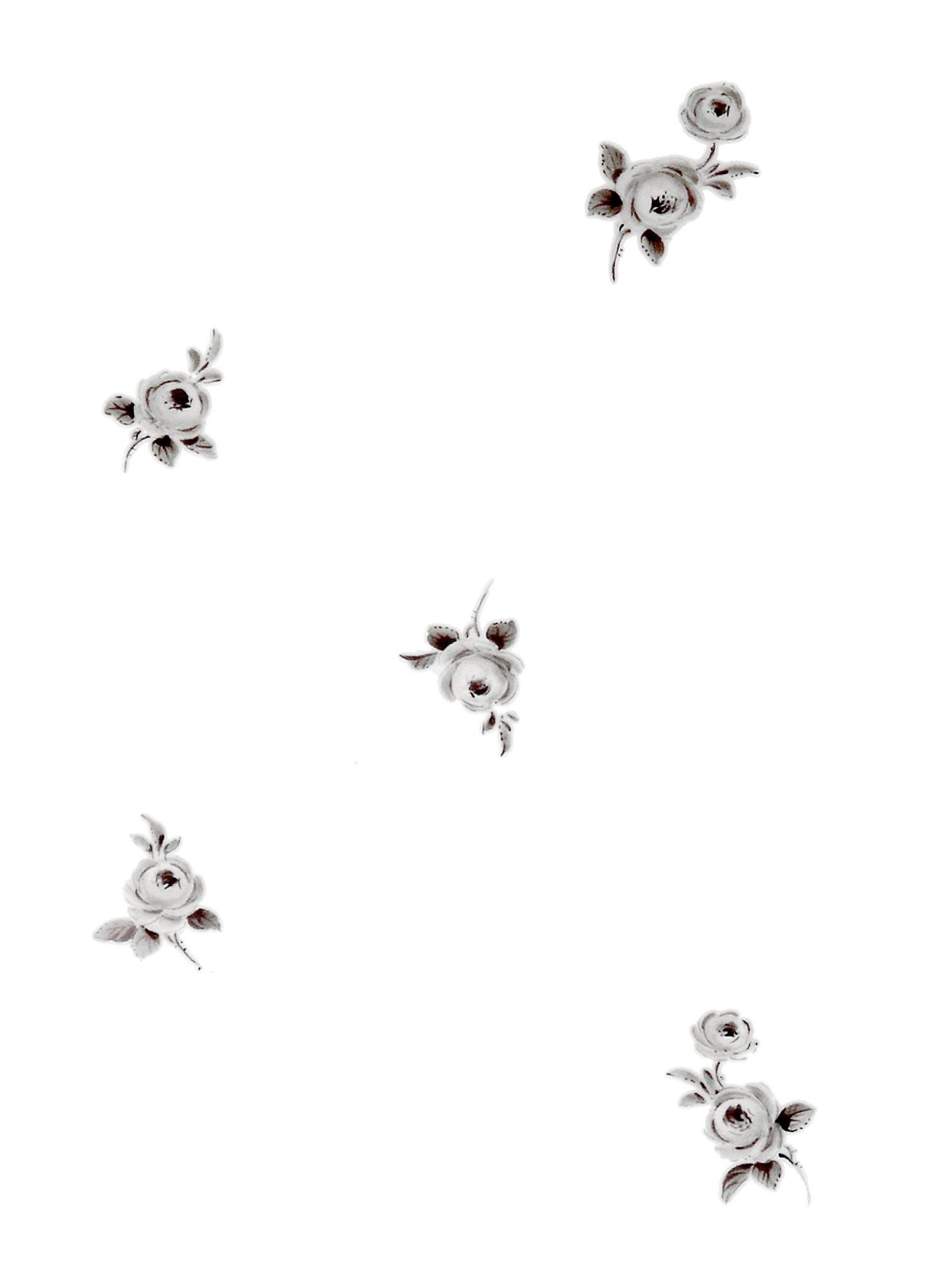 Gestreute RöschenUnter den Dekoren gehören die zwischen 1815 und 1845 entstandenen „Gestreuten Blümchen“ zu den beliebtesten der Manufaktur. Sie sind eine typische Schöpfung des Biedermeier. Zu jener Zeit bedienen sich die Porzellanmaler der Manufaktur floraler Symbolik, um Gedanken und Empfindungen zum Ausdruck zu bringen. Die Rose nimmt als Sinnbild der Liebe unter allen Blumenmotiven eine Sonderstellung ein. Im Dekor wird sie als vergrößerte Mittelblume von mehreren vielgestaltig variierten kleineren Rosen umstreut. Die detailreiche Ausarbeitung bezeugt die botanische Kenntnis und das meisterliche Handwerk der Porzellanmaler.
