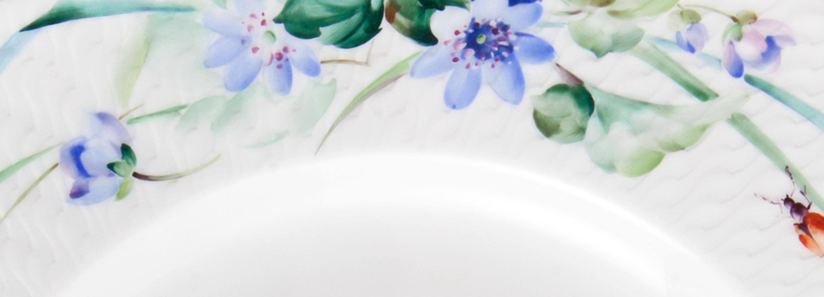 Gestreute Blümchen„Gestreute Blümchen“ gehört zu den beliebtesten Dekoren der Manufaktur Meissen. Anfang des 19. Jahrhunderts entstanden, ist er eine typische Schöpfung des Biedermeier. Blüten und Blumen sollen in ihrer natürlichen Schönheit gezeigt werden und sich damit erstmals von den ‘indianischen’ nach ostasiatischen Vorbildern absetzen. Als besondere Spielart der Manierblumenmalerei, besitzt der Meissener Dekor eigene Merkmale. Eine vergrößerte Mittelblume wird von mehreren vielgestaltig variierten kleineren Blumen umstreut. Die Porzellanmaler können hierfür auf drei Dutzend Blumenmotive zurückgreifen – jedes mit eigener Symbolik, die zu Zeiten des Biedermeier verwendet wird, um Gedanken und Empfindungen auszudrücken. En Detail per Hand auf Porzellan gemalt, verleihen die „Gestreuten Blümchen“ eine besondere Lebendigkeit und innere Symbolik.