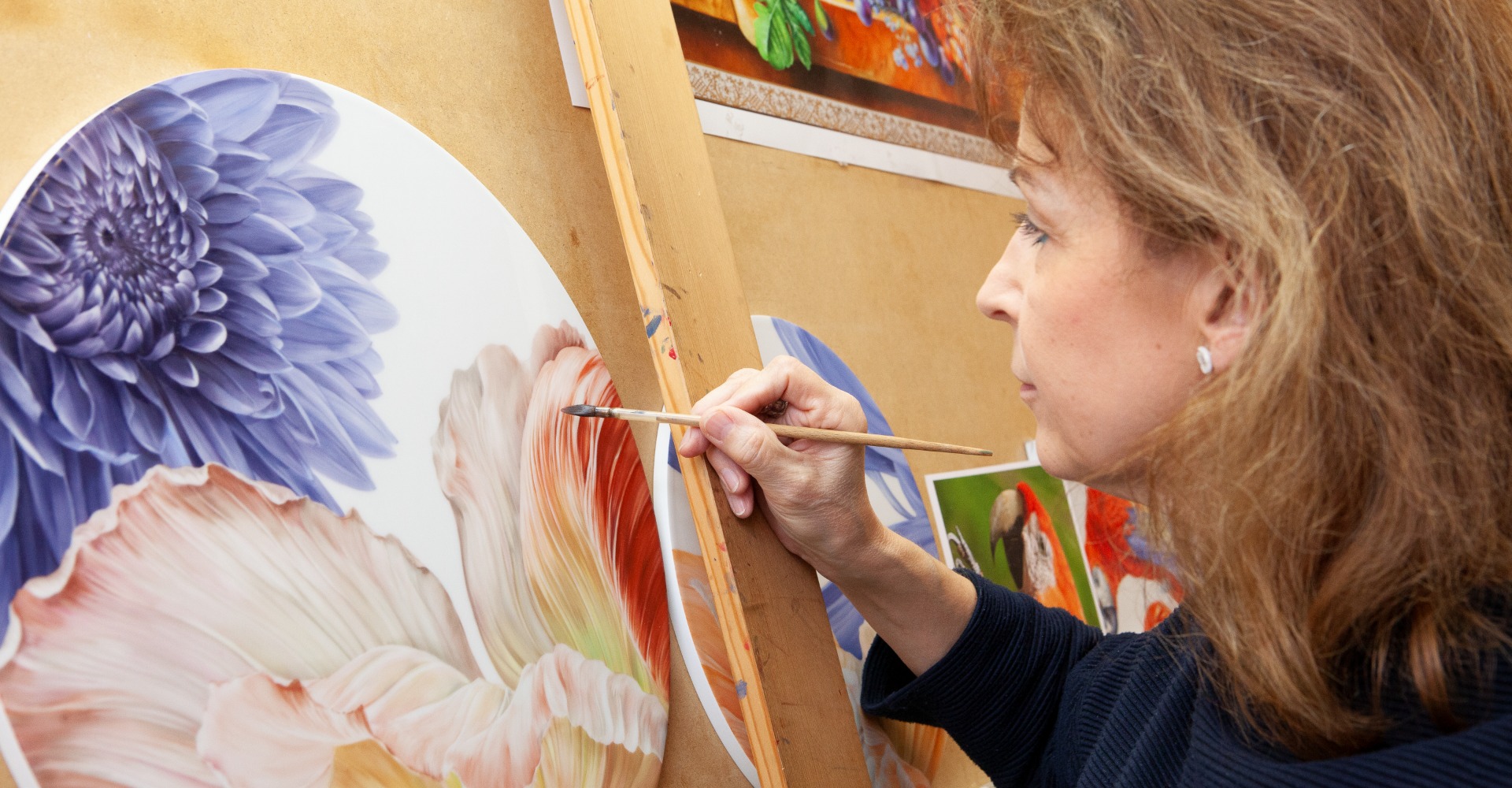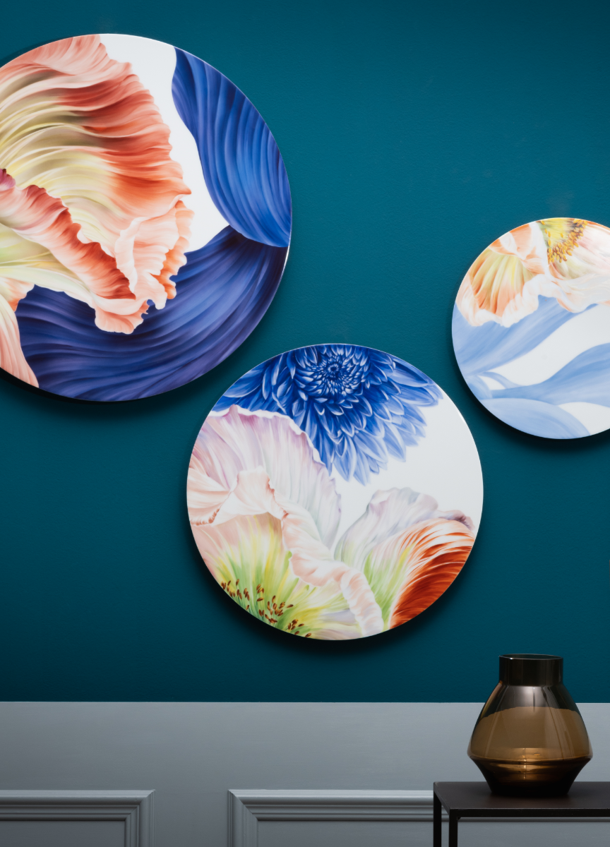 Wandbilder Giant Bloom“Die dreiteilige Wandbildserie der Limitierten Meisterwerke 2021 ist inspiriert von der gleichnamigen Vase der Limitierten Meisterwerke 2020 und zeigt moderne Blumenmalerei auf Meissener Porzellan. Die großflächige Handmalerei überzieht das Objekt in stilisierter Form. Abstrakt angeordnet, harmonieren die Blumen in ungewohnter Größe mit der neuartigen, runden Form des Wandbildes. Neben der unnachahmlichen Leuchtkraft Meissener Farben zeigen die Wandbilder eine herausragende Verbindung aus Tradition und Innovation. Die Blumenmalerei auf Meissener Porzellan gibt es bereits seit dem 18. Jahrhundert. "Giant Bloom" ist eine moderne Interpretation des traditionsreichen Dekors und ein wunderschönes Beispiel für einzigartiges Kunsthandwerk. -
