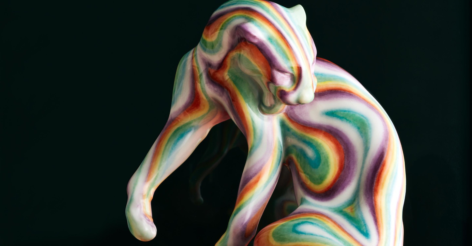„Regenbogen Panther“ ist eine kontrastreiche Neuinterpretation der historischen Plastik von Erich Oehme durch Kreativdirektor Otto Drögsler. Der lebendige Regenbogen Dekor entsteht durch die kunstgerechte Kombination aus Malerei und Stubben mit feinsten Pinseln sowie über mehrere Dekorbrände.