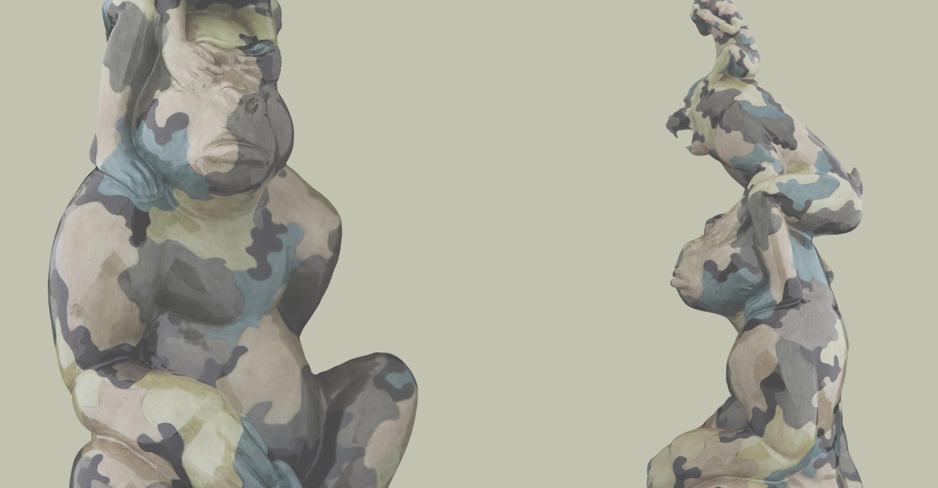 Mit ihrer Interpretation der „Drei Affen“ schafft Plastikerin Maria Walther eine expressive Darstellung in der Meissener Tradition der Tierplastiken. Der aufwendige Camouflage-Dekor unterstreicht das Zitat, der ohne naturalistische Vorlage höchstes malerisches Abstraktionsvermögen verlangt.