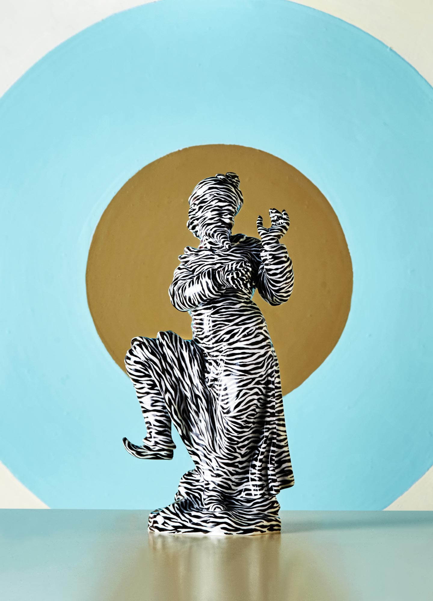 Japanische Tanzfigur mit Zebra-StaffageDie Verbindung historischer Figuren mit zeitgenössischen Dekoren zieht sich durch die Geschichte der Manufaktur. Indem er die „Japanische Tanzfigur“ von Peter Reinicke aus dem Jahr 1743 in feinste Zebra-Staffage hüllt, entscheidet sich Kreativdirektor Otto Drögsler für den bewussten Widerspruch. Mit viel künstlerischem Geschick folgen verschiedene Schwarz- und Grautöne in filigranen Linien der fließenden Bewegung der Figur, keiner der Streifen ist unterbrochen. Entgegen der Tradition Gewand oder Gestik durch realistische Malerei zu betonen, lässt der Dekor einige plastische Details der Statue zurücktreten und die Tanzfigur lediglich als Silhouette erscheinen. Darüber hinaus steht der Dekor für das ungesehene Zusammenspiel gegensätzlicher Kulturkreise: Das Zebradesign kommt im japanischen Farb- und Musterkodex eigentlich niemals vor.