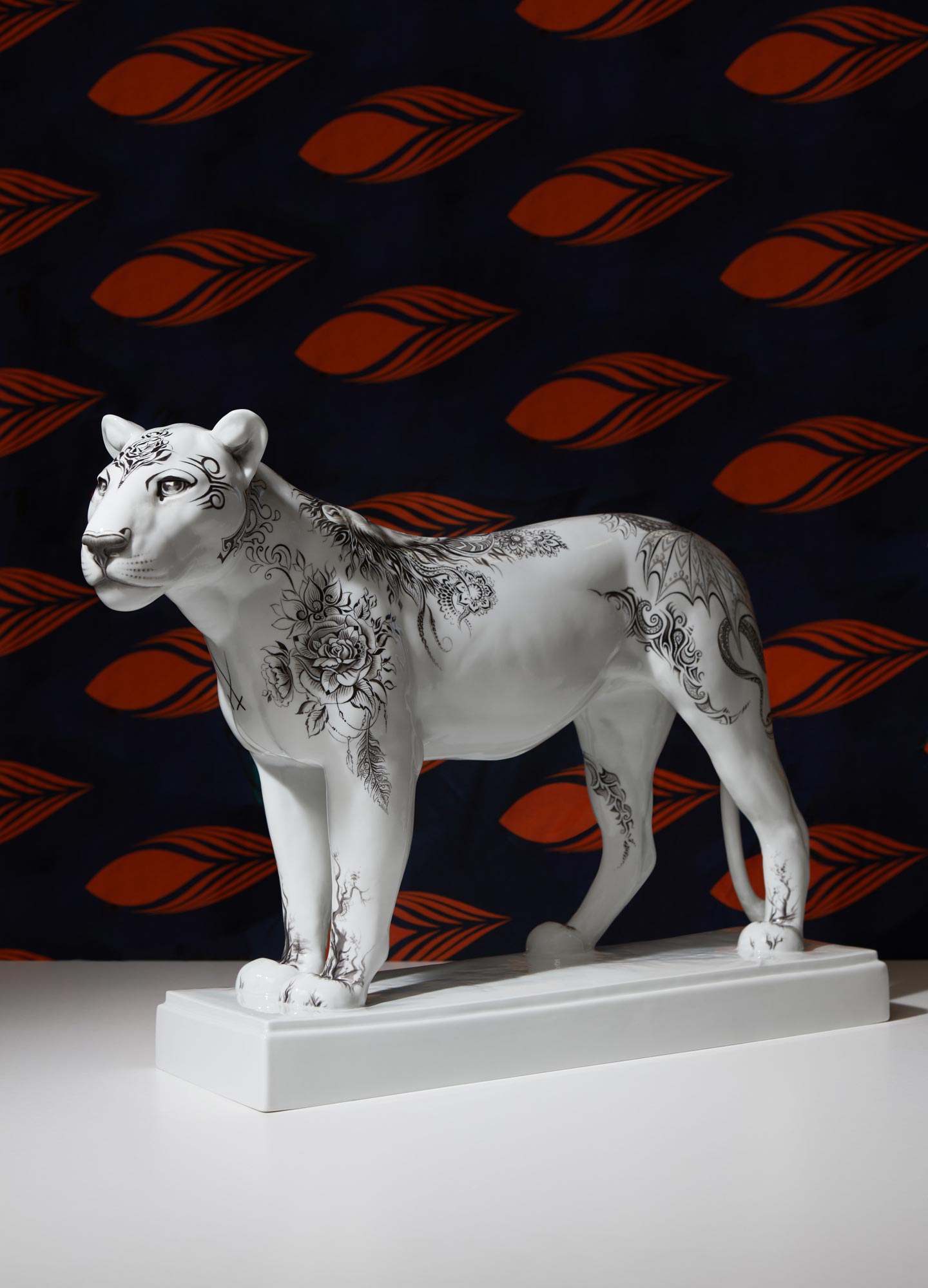 Tattoo LöwinFür die Arbeit „Tattoo Lioness“ schafft Otto Drögsler einen aufwendigen Dekor aus mannigfaltigen grafischen Tattoos, der in seiner Umsetzung an die monochrome Malerei erinnert. Der Dekor wird collageartig auf einzelne Stellen der historischen Skulptur einer Löwin von August Gaul aus dem Jahr 1922 aufgetragen und bestärkt diese in ihrer majestätischen Haltung. Die filigranen Tattoo-Motive sowie deren üppiger Einsatz stellen höchste Ansprüche an Präzision und Kunstfertigkeit der Meissener Porzellanmaler.