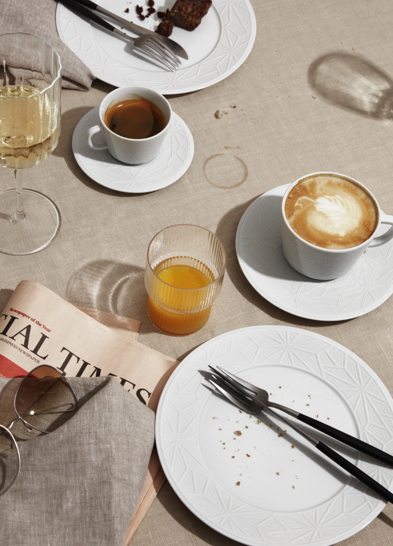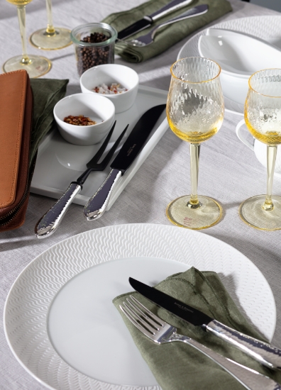 N°41 Wellenspiel ReliefEntdecken Sie das außergewöhnliche Service, das die Geradlinigkeit der Form „N°41“ mit dem schwungvollen Relief der beliebten Form „Wellenspiel“ zu einem einmalig modernen Erscheinungsbild vereint.