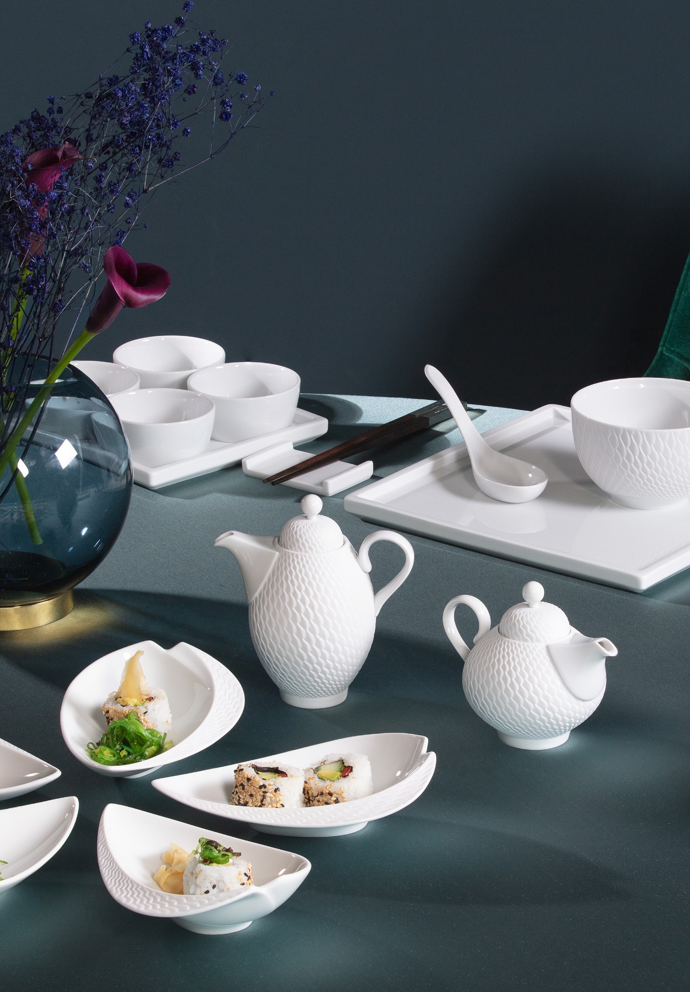 Asien KollektionDas perfekte Service für Liebhaber der asiatischen Küche mit einem schwungvollen Wellen-Relief für maritimes Flair. -