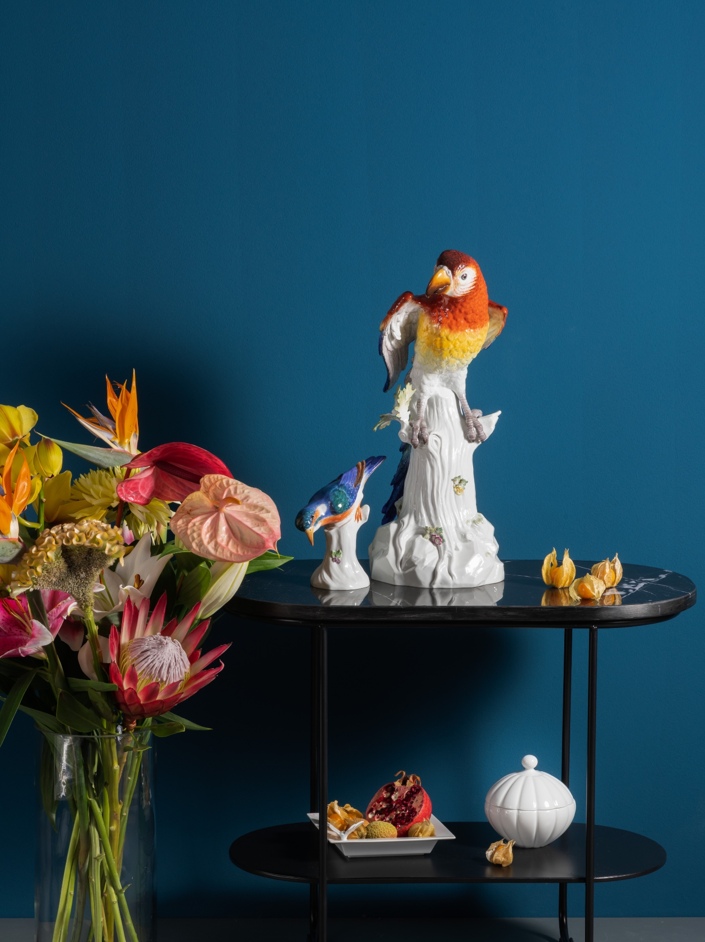 Zusammen mit maritimem Dekor wie die Meeresmotive von „MEISSEN Blue Treasures" entsteht eine sinnliche Nähe zu Strand und Meer. Anders die prächtigen Räume im südost-asiatischen Stil, die durch symmetrische Gestaltung, eine kräftige Farbgebung, farbenfrohe Orchideen und prächtige Porzellanvasen einen Wow-Effekt garantieren. Soll die Reise in die Tropen führen, sind es strahlende Farben, exotische Tier- und Pflanzenmotive und opulente Edelmetall-Akzente, die uns begegnen – Ananasdosen und Blattschalen sowie handbemalte Papageie, Leoparden und Affen, die in Meissener Porzellan gekonnt Ausdruck finden.