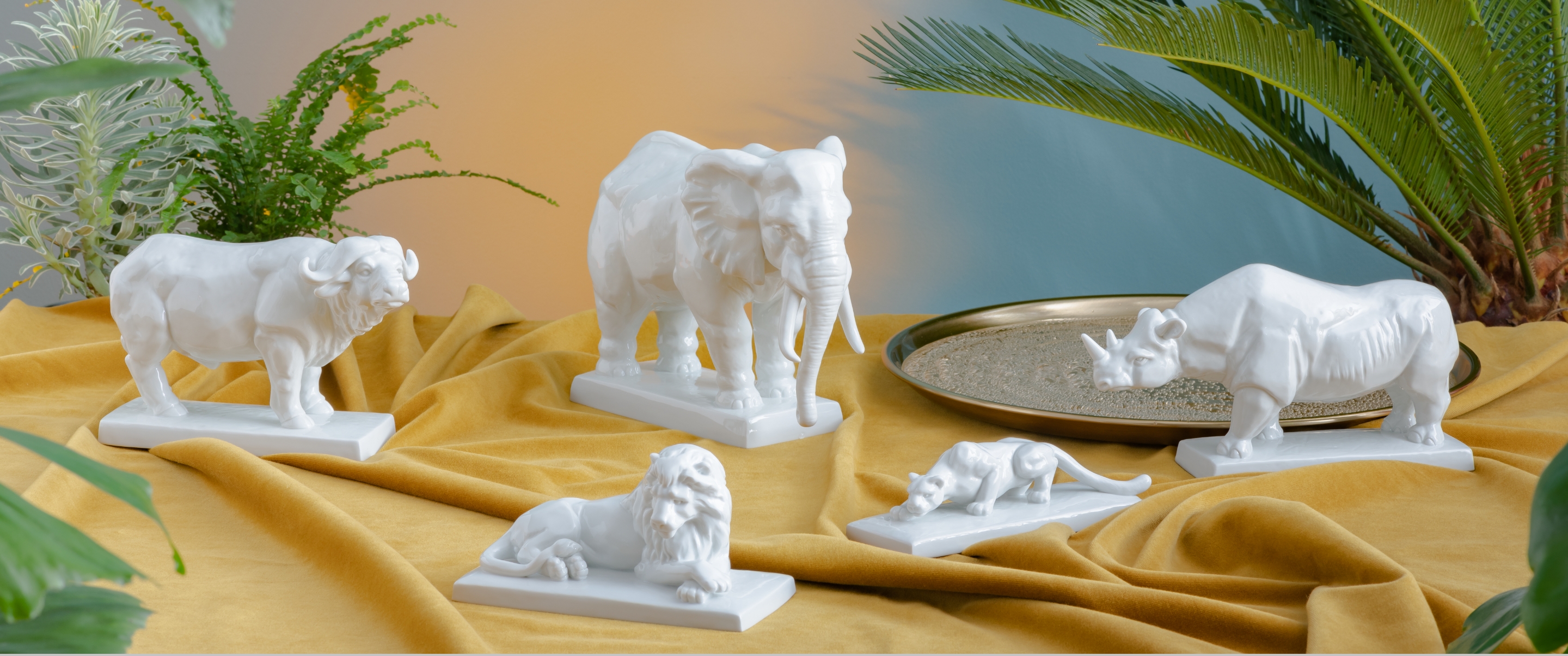 „Big Five“ von Maximilian Hagstotz zeigt erstmalig die namensgebenden „Großen Fünf“ – Büffel, Löwe, Elefant, Leopard und Nashorn – als einheitliche Figurengruppe im charakteristischen Schnitz-Stil, der von afrikanischen Holzskulpturen inspiriert ist. Ein grafischer Dekor, angelehnt an traditionelle afrikanische Muster, verleiht dem Porzellan einen grafischen Kontrast und den Figuren eine faszinierende Symbolkraft. Mit der Wandbildserie „Tiere aus Afrika“ schuf der Meissener Porzellanmaler Detlef Ritter eine bildnerische Hommage an den Kontinent und entwickelte zwecks dessen einen detailriechen, expressiven Stil, der das Auge fängt und über das Wandbild wandern lässt. Ein Statement Piece, das zum Blickfang in jedem Raum wird. Wohin die gestalterische Reise unserer Innenräume uns auch hinführt, mit MEISSEN lassen Sie Ihre Träume von fernen Welten in den eigenen vier Wänden wahr werden.