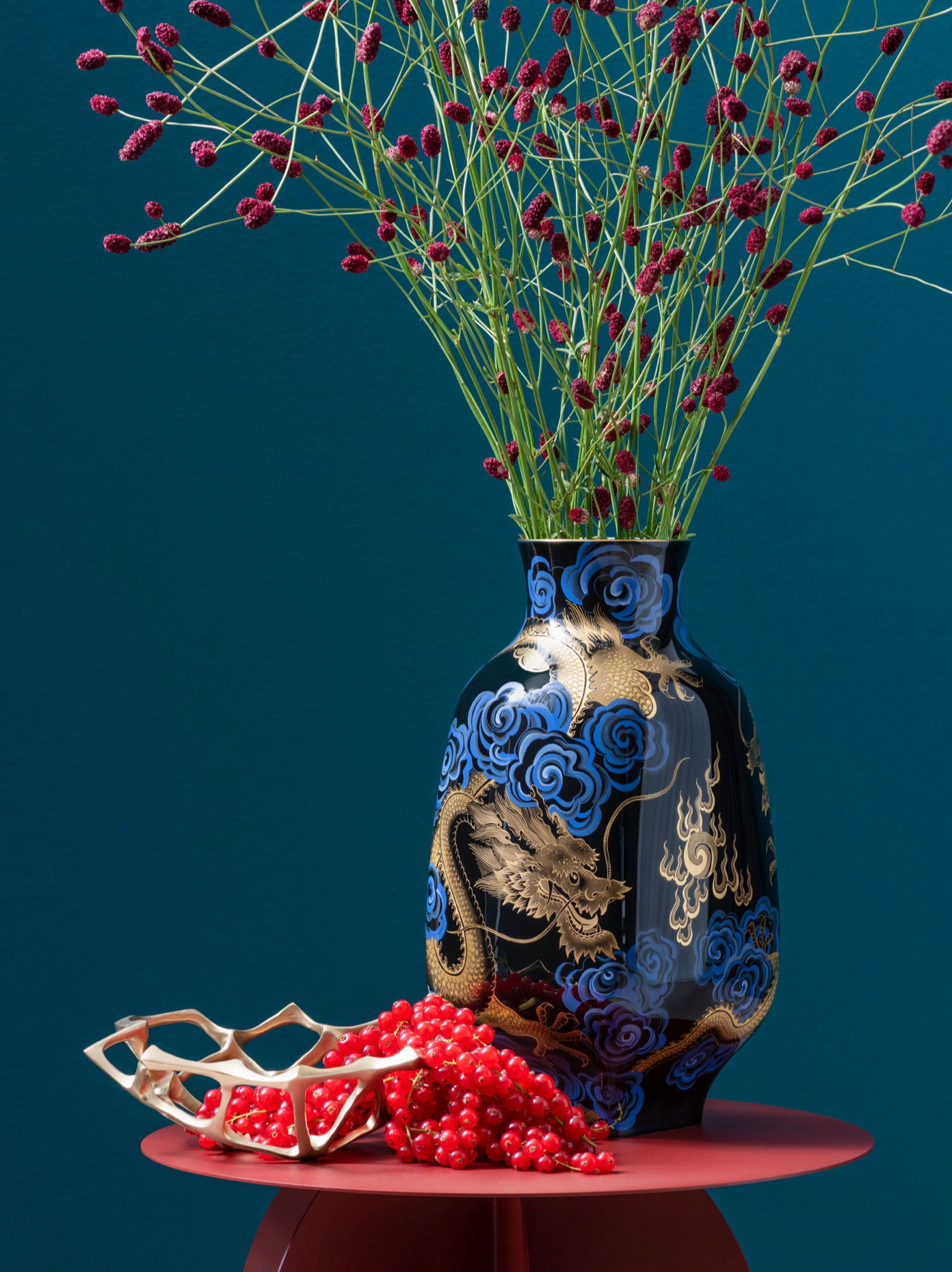 Wieder neigt sich ein Jahr dem Ende entgegen, ein Moment, um kurz innezuhalten und die letzten Monate Revue passieren zu lassen. 2022 war geprägt von Gegensätzen. Das Jahresmotto „Far & Fantasy – Entdecke das Unerwartete“ entführte uns in eine Welt voller fantastischer Porzellane, exotischer Dekore und fremder Fabelwesen. Die „Giant Bloom“-Serie aus dem Vorjahr wurde um weitere Exponate ergänzt. Auf großen Wandbildern und Tellern leuchten farbenprächtige Mohn- und Irisblüten mit exotischen Tigerlilien um die Wette. Plastisch fand die Blumenmalerei in der Bloom-Collection ihre Entsprechung: Erstmals wurde in einer Schmuckkollektion der komplette Werdegang einer Lilie von der Knospe bis zur reifen Blüte nachvollzogen. Nach mehrjähriger Entwicklungszeit gelang die komplizierte Herstellung von schimmernden Porzellanperlen, die sich in unserer exklusiven Pearl-Collection wiederfinden. Die Geflügelte Löwin – halb Greif, halb Drache – zierte unsere diesjährige Weihnachtskollektion und lässt Assoziationen an Sphinxe und mächtige Engel entstehen. Würdig vollendet wurde die Fantasiereise mit der Geburt unseres neuen Glücksdrachens, als Highlight unserer limitierten Kunstwerke.