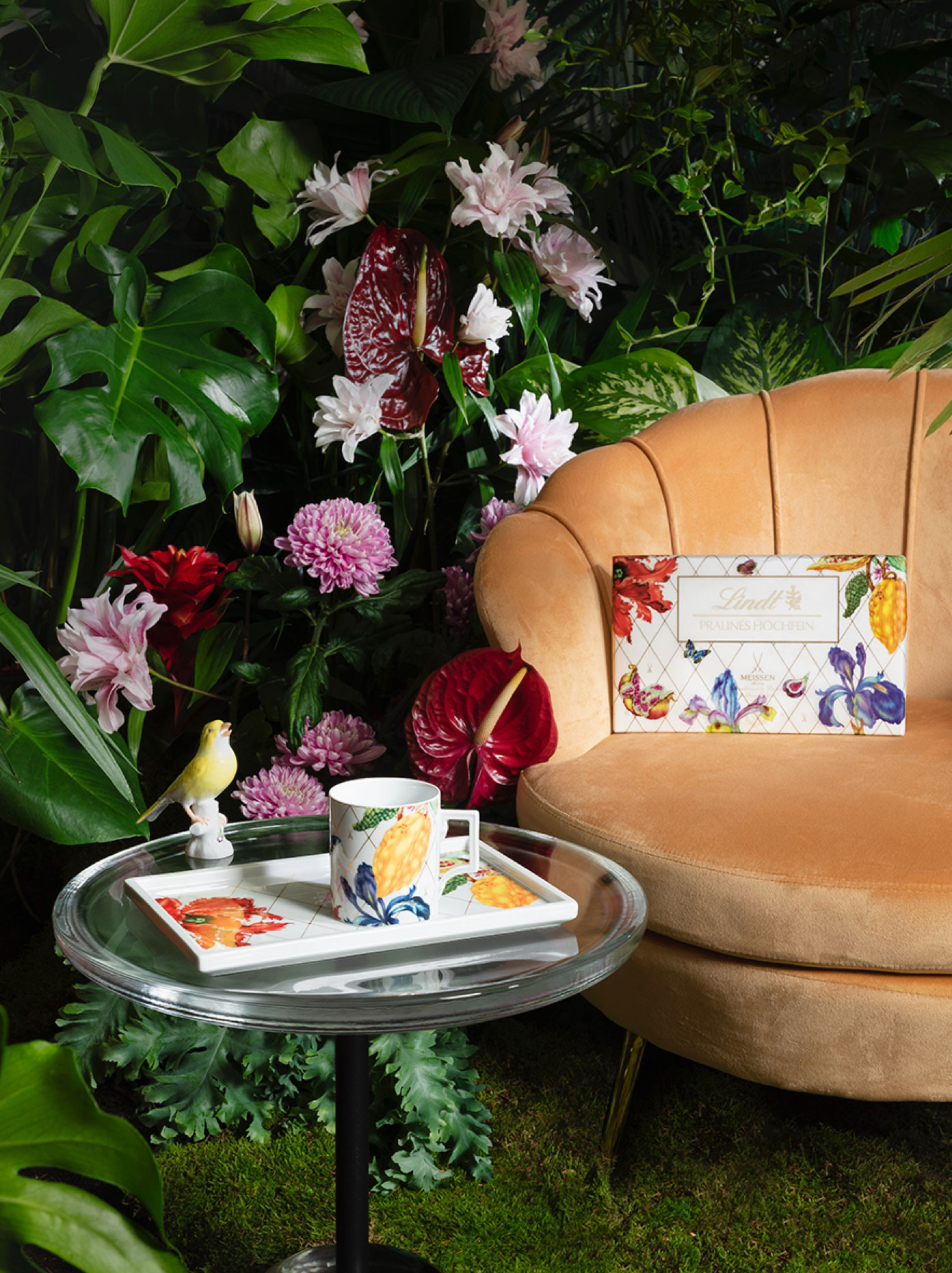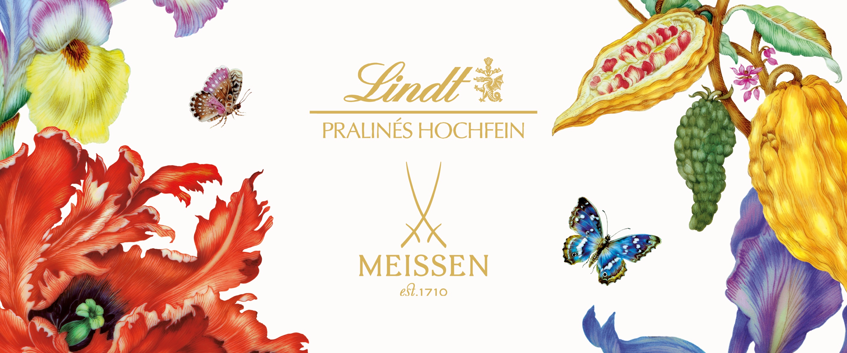 Was haben MEISSEN Porzellan und der Schweizer Chocolatier Lindt gemeinsam? Ganz klar: Die Liebe zur süßesten aller Versuchungen - zur Schokolade! Vereint durch ihre Leidenschaft für höchste Handwerkskunst, vollendetes Design und sinnlichen Genuss, haben Lindt und MEISSEN zu einer außergewöhnlichen Kooperation zusammengefunden: Für eine limitierte Sonderauflage der Lindt HOCHFEIN Pralinés, hat die Porzellanmanufaktur MEISSEN die Gestaltung der Geschenkverpackung übernommen. Goldene Kakaobohnen leuchten in berührender Schönheit mit üppigen Federmohnblüten, Irisblumen und sonnenreifen Feigen um die Wette, umspielt von zarten Schmetterlingen als einem Sinnbild für filigrane Perfektion.