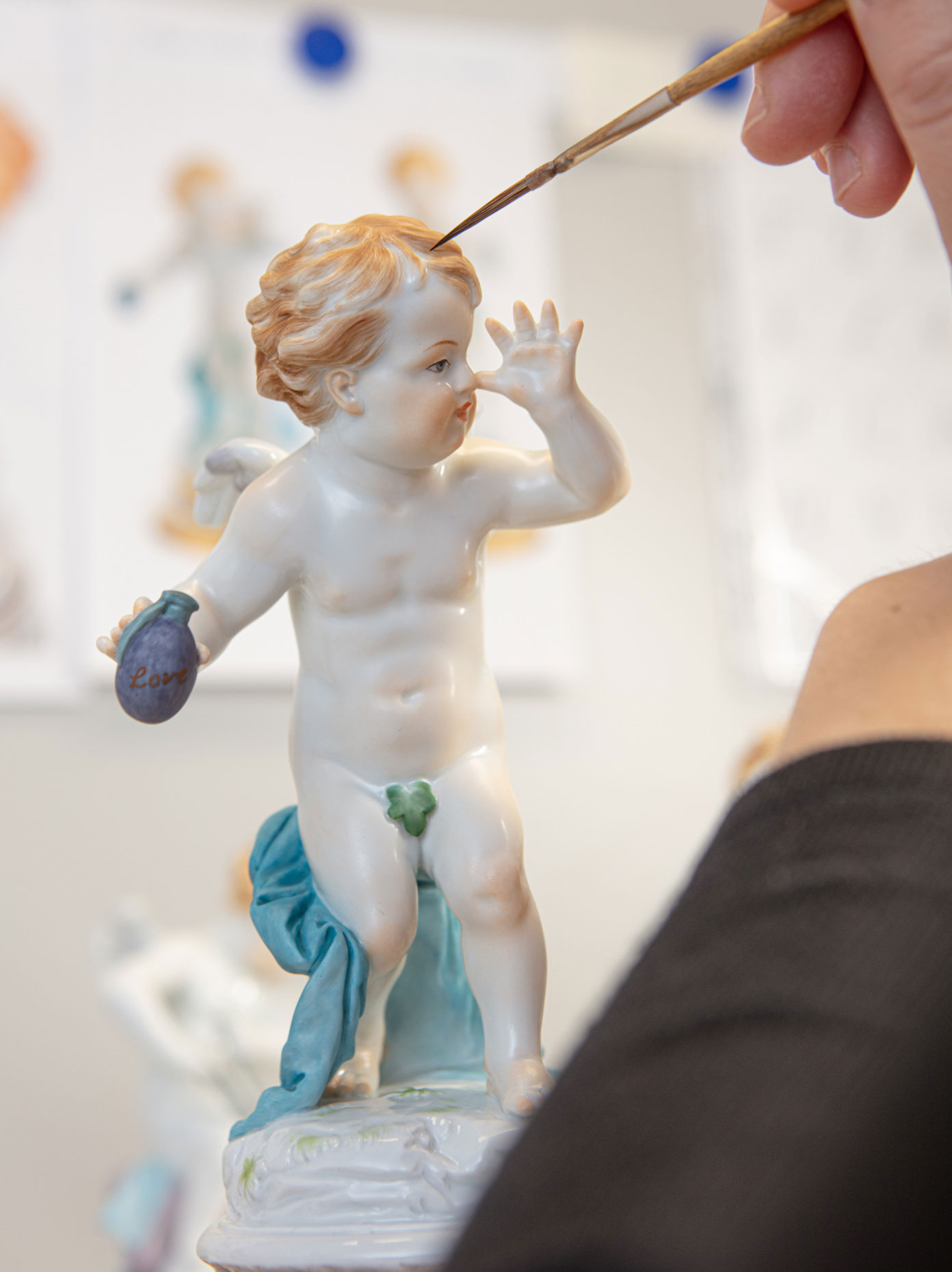 Den Bemühungen Amors wurde schon zwischen 1877 und 1880 von Bildhauer Heinrich Schwabe Ausdruck verliehen. Das etablierte Mitglied des Meissener Figurenensembles bescherte dem Liebesboten auf ironisch-humorvolle Art und Weise menschliche, fast bürgerliche Züge. So flickt eine von Schwabes Figuren als Schneider ein zerbrochenes Herz, während ein anderer als Schmied das Feuer der Liebe entfacht.