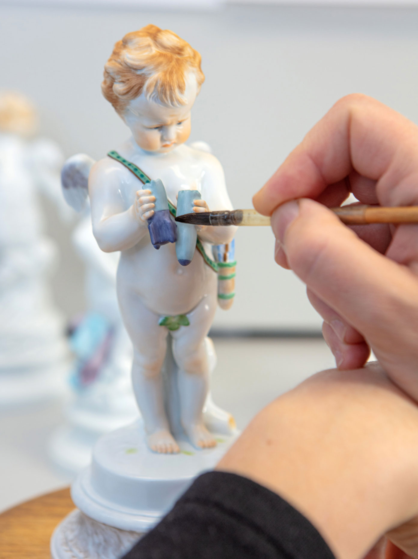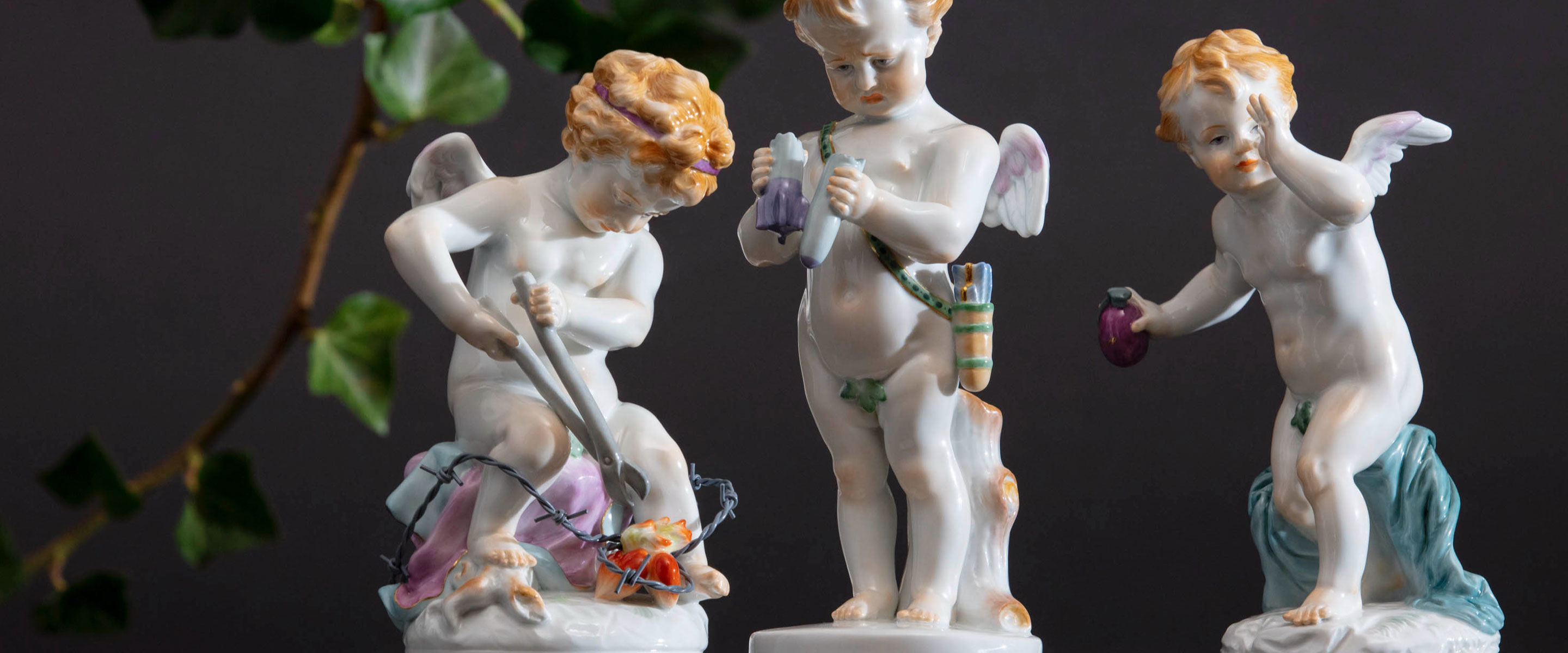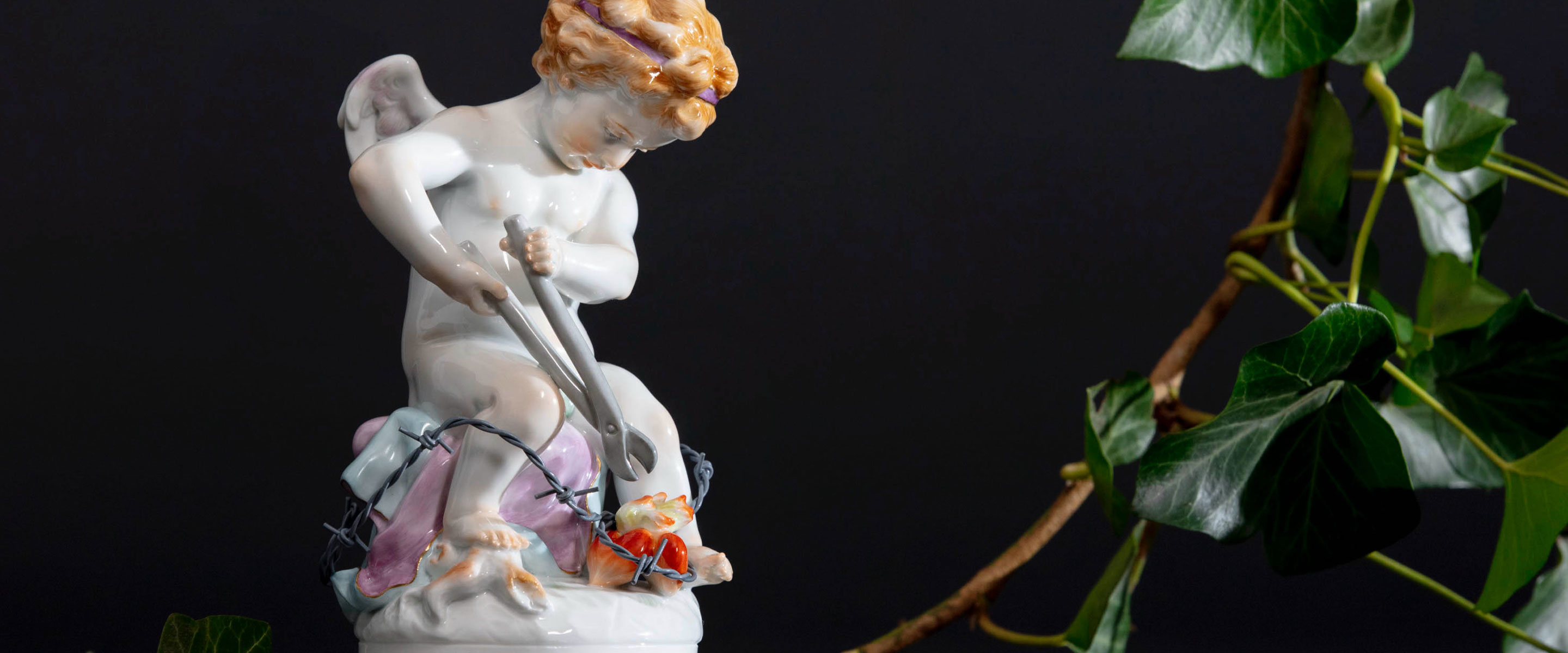 Bereits in früheren Jahrhunderten waren Porzellanfiguren nicht nur schöne Dekoration auf einer festlichen Tafel. Sie dienten auch dazu, zu Gesprächen anzuregen - nicht selten amüsant und manchmal auch provozierend. Denn nichts liebte das Volk bei Hofe mehr, als gut unterhalten zu sein und über delikate Themen zu plaudern. Und auch Magnus Gjoen möchte über seine Interpretation der Amorfiguren zum Austausch der Menschen anregen, für mehr Miteinander und Achtsamkeit. Dafür hat er die urspürglich liebensbezogenen Objekte der Amorfiguren ersetzt durch Stacheldrahtzaun, Granate und Rakete.