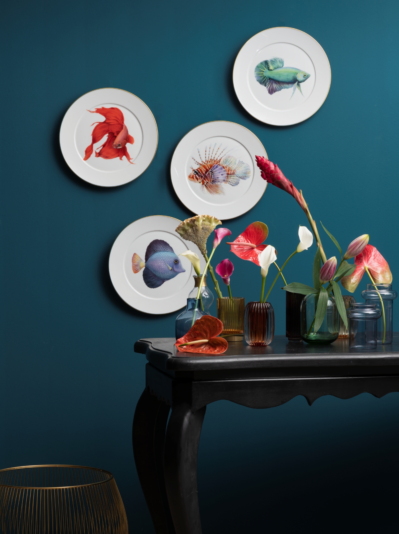 Exotische Korallenbewohner hingegen sind der Fokus der maritimen Wandteller-Serie von Andrea Mauersberger. Die Meissen Künstlerin kombiniert darin erstmals eine traditionsreiche Technik, die Aufglasurmalerei, mit modernem Malstil auf den klaren, minimalistischen Formen des "MEISSEN® Cosmopolitan" Service und fängt die farbenprächtigen Meeresbewohner in all ihrer einzigartigen Schönheit ein. Glanzlichter in den Augen, einfallendes Licht, das sich auf dem Schuppenkleid reflektiert, Farben und Schattierungen, die sich mit der Bewegung verändern – in diesen einzigartigen Malereien der Limited Edition kommt die faszinierende Fauna türkiser Tiefen in erhabenem Kunsthandwerk für die Ewigkeit zum Ausdruck und bietet einzigartige Dekorationsideen für Ihr zuhause.