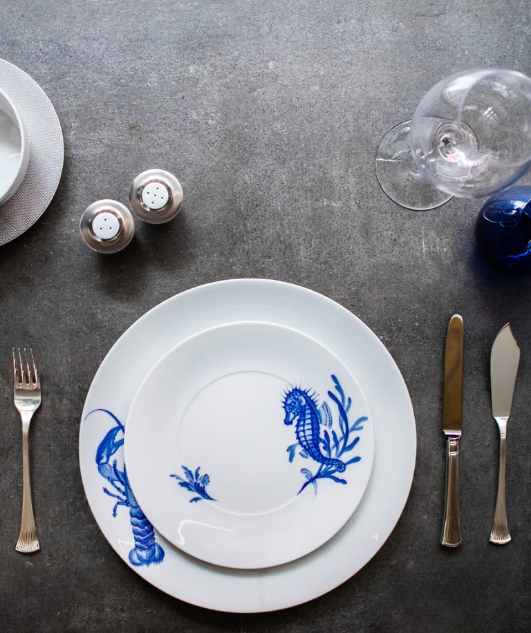 In geübten Pinselstrichen werden die bewegten Motive – Hummer, Seepferdchen, Muscheln und verschiedenste Fische – auf das noch unglasierte Porzellan appliziert und durch mehrfaches Auftragen schattiert und zum Leben erweckt. Korrekturen sind dabei nicht möglich, da die Farbe sofort in den Scherben einzieht. Im zweiten Brand erstrahlt die Malerei unter schützender Glasur dann schließlich im charakteristischen Kobaltblau. Ein gestalterischer Aufwand, der sich nicht nur ästhetisch, sondern auch ganz praktisch lohnt: alle Teile der Kollektion sind dank Unterglasurmalerei spülmaschinenfest, mikrowellengeeignet und bedenkenlos stapelbar – perfekt, um auch im alltäglichen Gebrauch und eigenen Interieur ein maritim sommerliches Ambiente einziehen zu lassen. Ob als kohärente Tafel oder im zutiefst persönlichen Mix & Match Stil.
