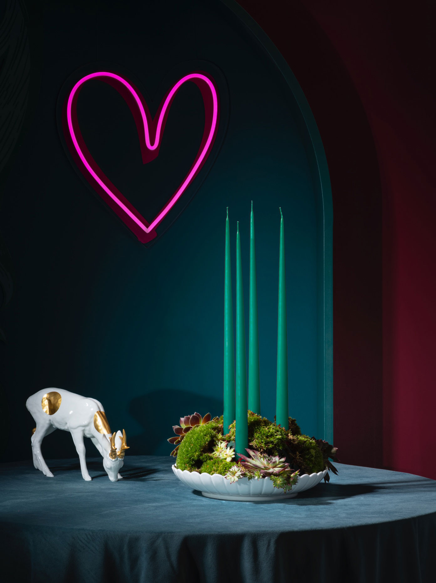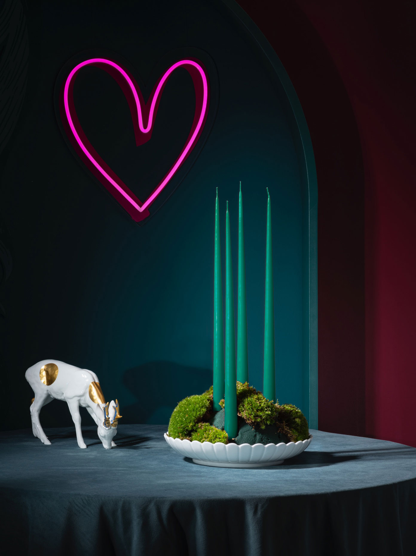 5. Komplettieren Sie Ihren „Kranz“ abschließend mit kleinen Details aus Meissener Porzellan. Besonders gut eignen sich dafür die verschiedenen Anhänger aus Biskuitporzellan, Weihnachtskugeln, Tannenzapfen und Eicheln, oder auch unsere MEISSEN Tierkinder. Ein ergänzendes Higlight sind MEISSEN Figuren, z. B. unsere Rehe mit Goldpunkten.
