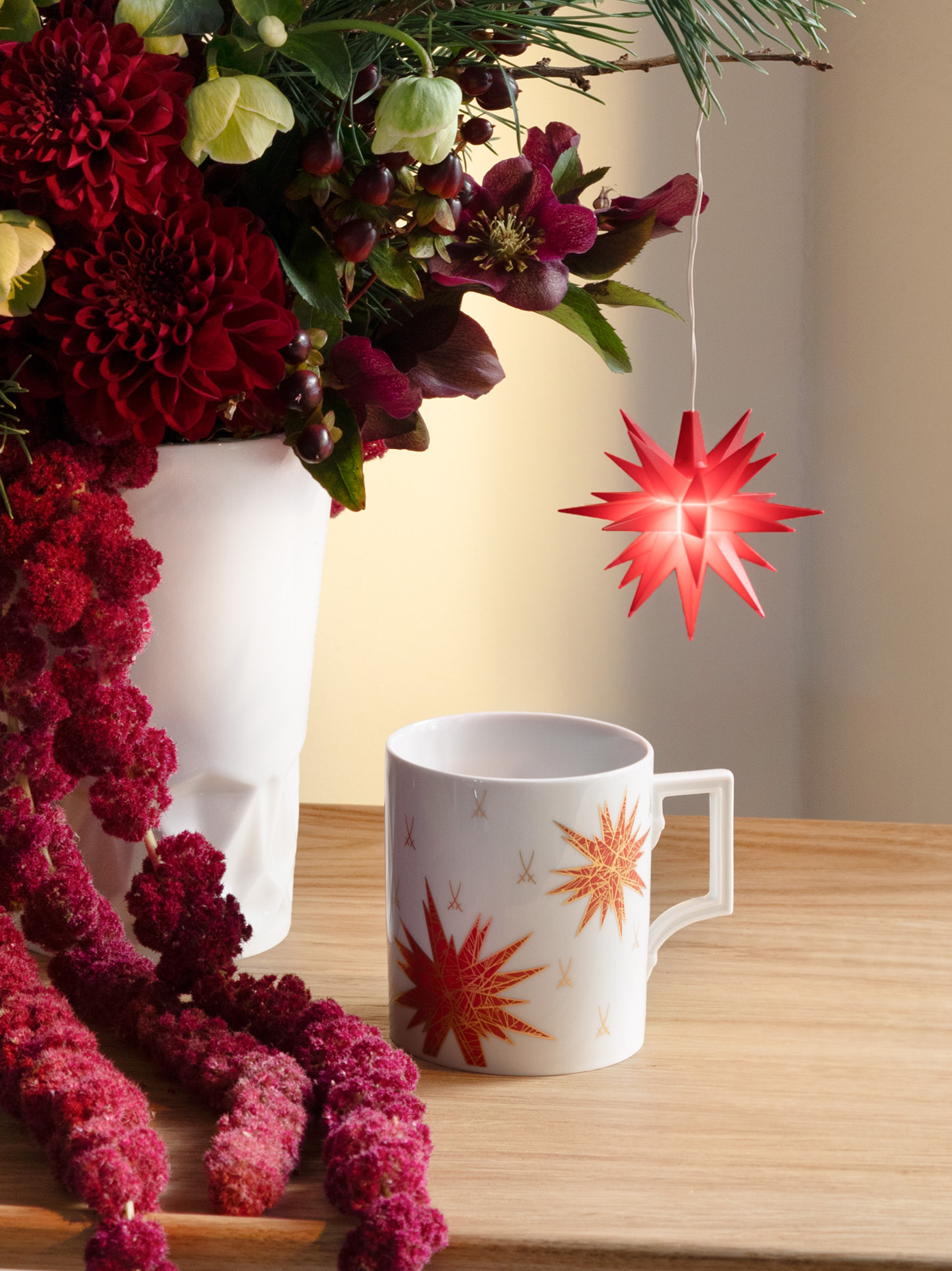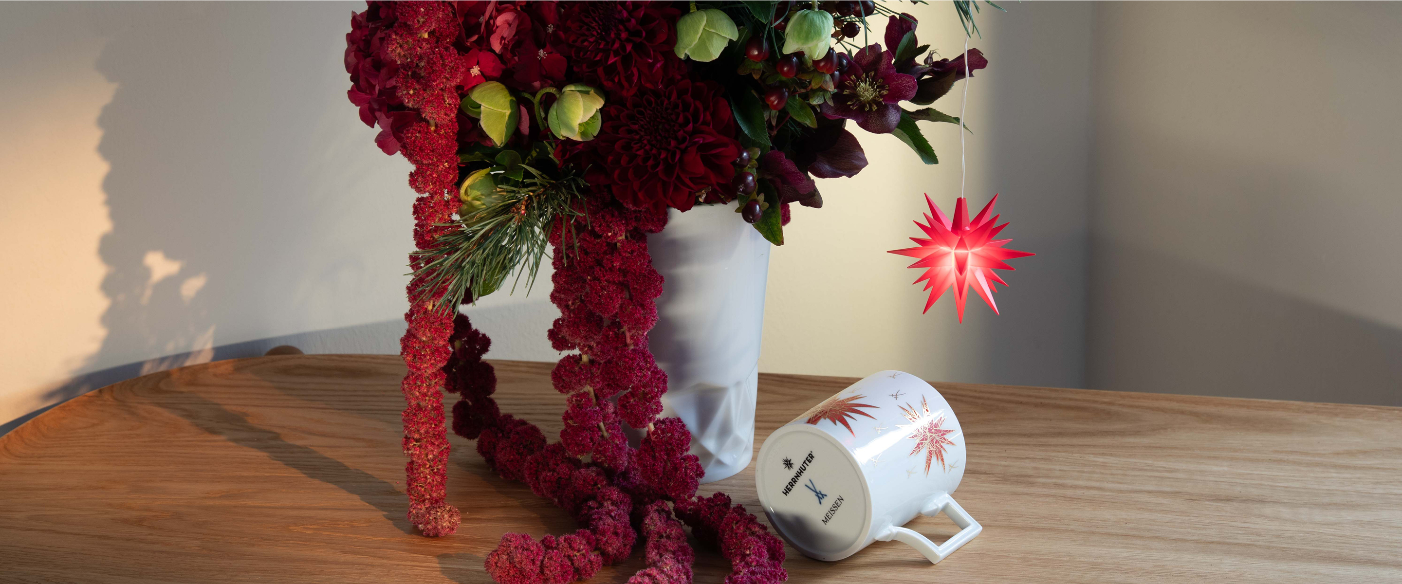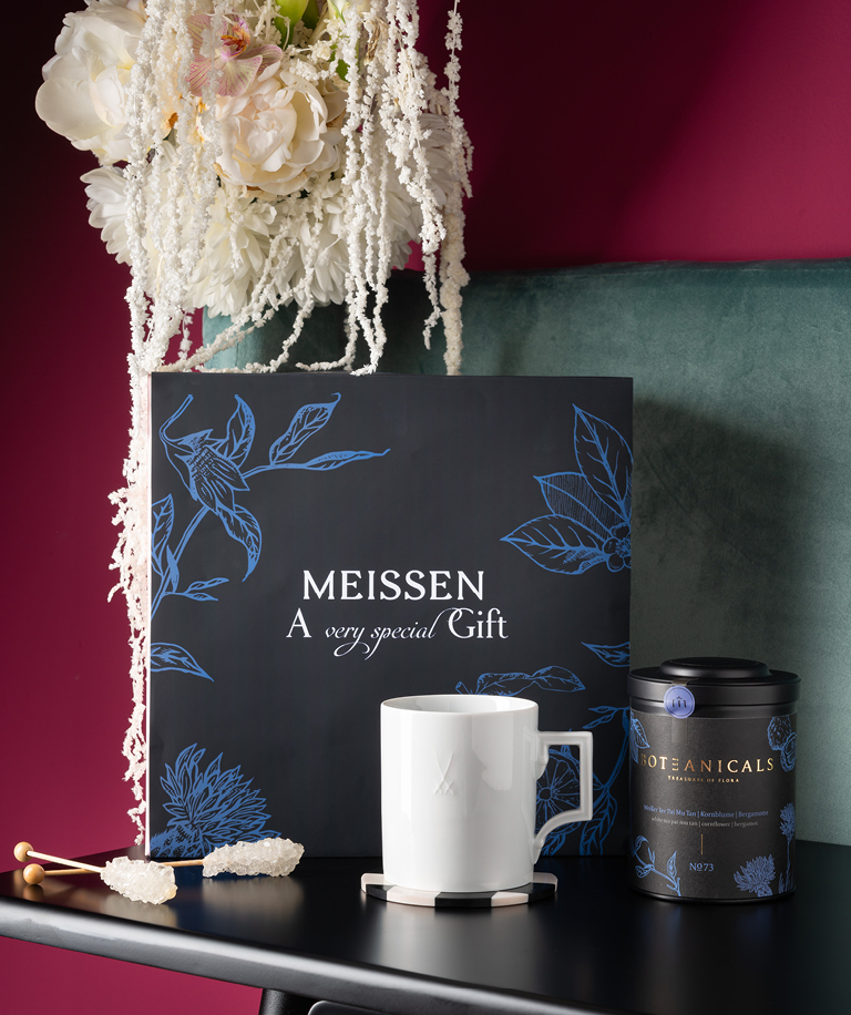 In dieser Weihnachtssaison haben sich MEISSEN und Herrnhut® zu einer außergewöhnlichen Kooperation zusammengefunden, um ein einzigartiges Geschenk-Set zu präsentieren, bestehend aus einem ikonischem MEISSEN Henkelbecher, verziert mit dem weihnachtlichen Herrnhuter®-Sterne-Dekor, und einem Miniatur-Herrnhuter® Stern. Dieses Set verbindet die traditionsreiche Porzellanmanufaktur mit der weihnachtlichen Symbolkraft des Sterns und bietet eine festliche Kombination, die sowohl optisch als auch symbolisch zu überzeugen weiß.