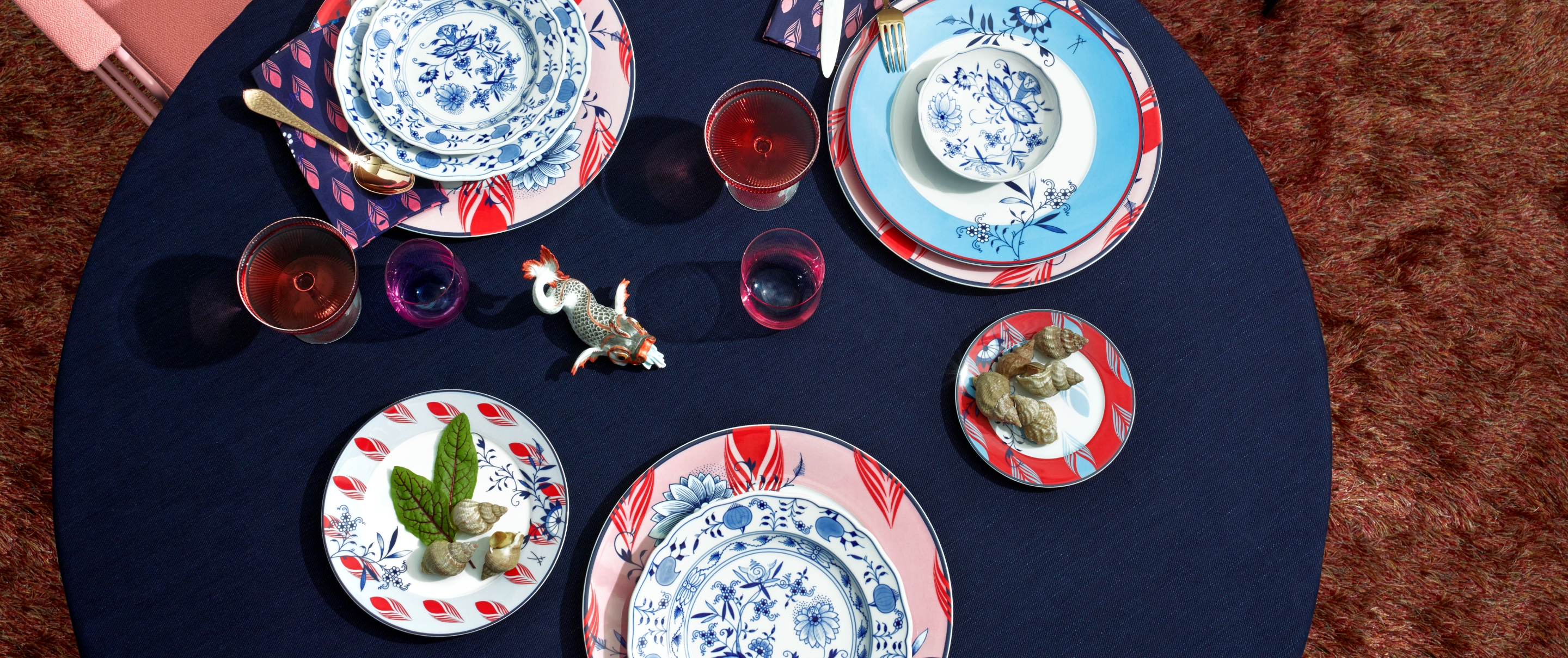 • Mixen Sie ganz bewusst die verschiedenen Stilrichtungen und bringen Sie Ihre historischen Erbstücke auf den Tisch. Dem historischen „Zwiebelmuster“ verleihen Sie neuen Glanz mit Porzellanen unserer „N°41 Paradise Birds Blush“ Kollektion. Die farblichen Akzente in Grün oder Rosa bringen Lebendigkeit und Frische auf den gedeckten Tisch. Zugleich umrahmen sie das ikonische Blau des Zwiebelmusters und heben es auf besondere Weise hervor. Wer es noch ein Stück farbenfroher mag, der kombiniert zum Zwiebelmuster die „Bloomy Feathers“ Porzellane aus unserer „THE MEISSEN COLLAGE“ Serie. Das Dekor kombiniert die unverwechselbaren Elemente des Originals in zartem Blau mit kräftigen Rottönen der markanten Feder. Die farblichen Kontraste sorgen für eine aufregende Verbindung, die den einzigartigen Charakter des Zwiebelmusters in neuem Glanz erstrahlen lässt.
