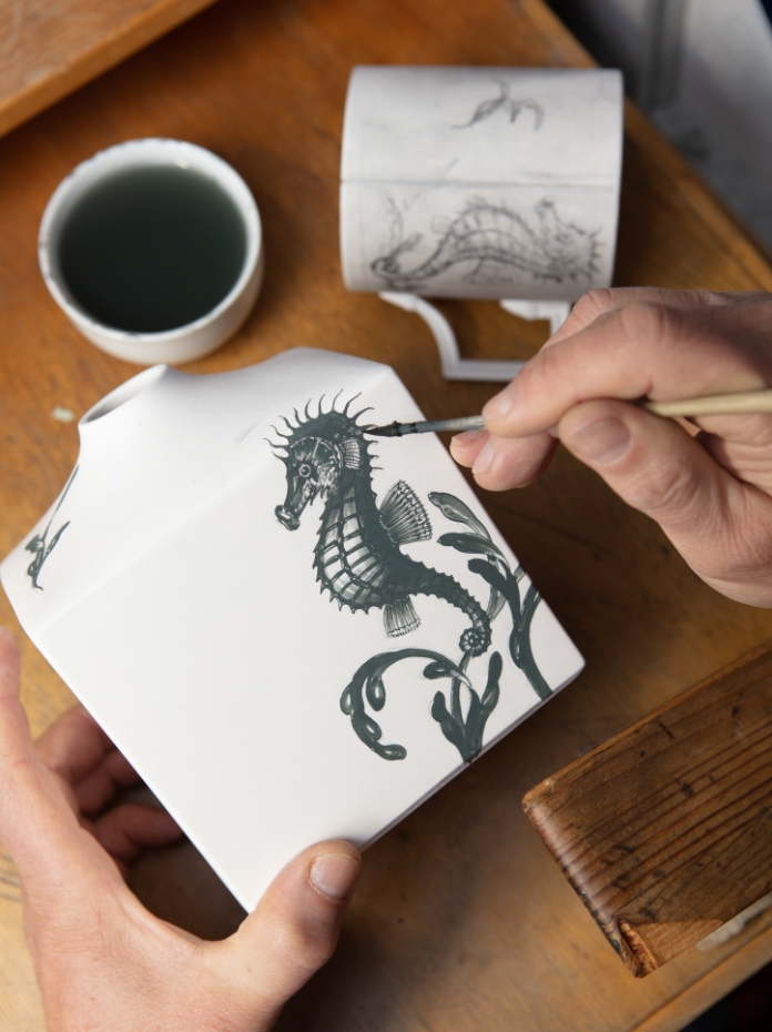Von Hummern und Seepferdchen bis hin zu Muscheln und Fischen, die aus dem Dickicht wogenden Seegrases hervorschauen: Seit ihrer Entstehung üben diese Unterwassermotive eine besondere Faszination aus, nicht zuletzt aufgrund der lebendigen Handmalerei im manufaktureigenen Kobaltblau. Den Strömungen des Wassers gleich fängt es die Motive in fließenden und dynamischen Pinselstrichen ein.