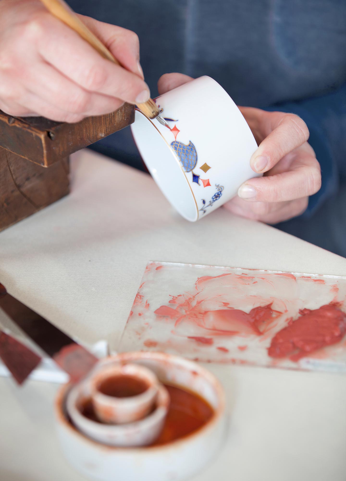 HandwerkskunstZwei spezielle Techniken der Porzellanmalerei kommen bei der Entstehung des "Noble Blue" Dekors zur Anwendung, die nach höchster Präzision und Sorgfalt verlangen. Zunächst wird in der Unterglasurmalerei von Hand die manufaktureigene kobaltblaue Farbe mit feinen Pinselstrichen auf das unglasierte Porzellan aufgetragen. Der noch poröse Scherben saugt die Farbe sofort auf, sodass Korrekturen unmöglich werden. Der Dekor erscheint nun in einem matten Grau. Erst nach dem Glasieren und dem darauffolgenden Glasurbrand erstrahlt das Blau. Spezielle Inglasurfarben kommen für die anschließende Veredelung mit Rot und Gold zum Einsatz. Mit einer Stahlfeder von Hand aufgebracht, sinken diese Farben beim erneuten Dekorbrand leicht in die Glasur ein und werden so durch diese geschützt. Eine abschließende Politur lässt die Golddekoration erstrahlen.