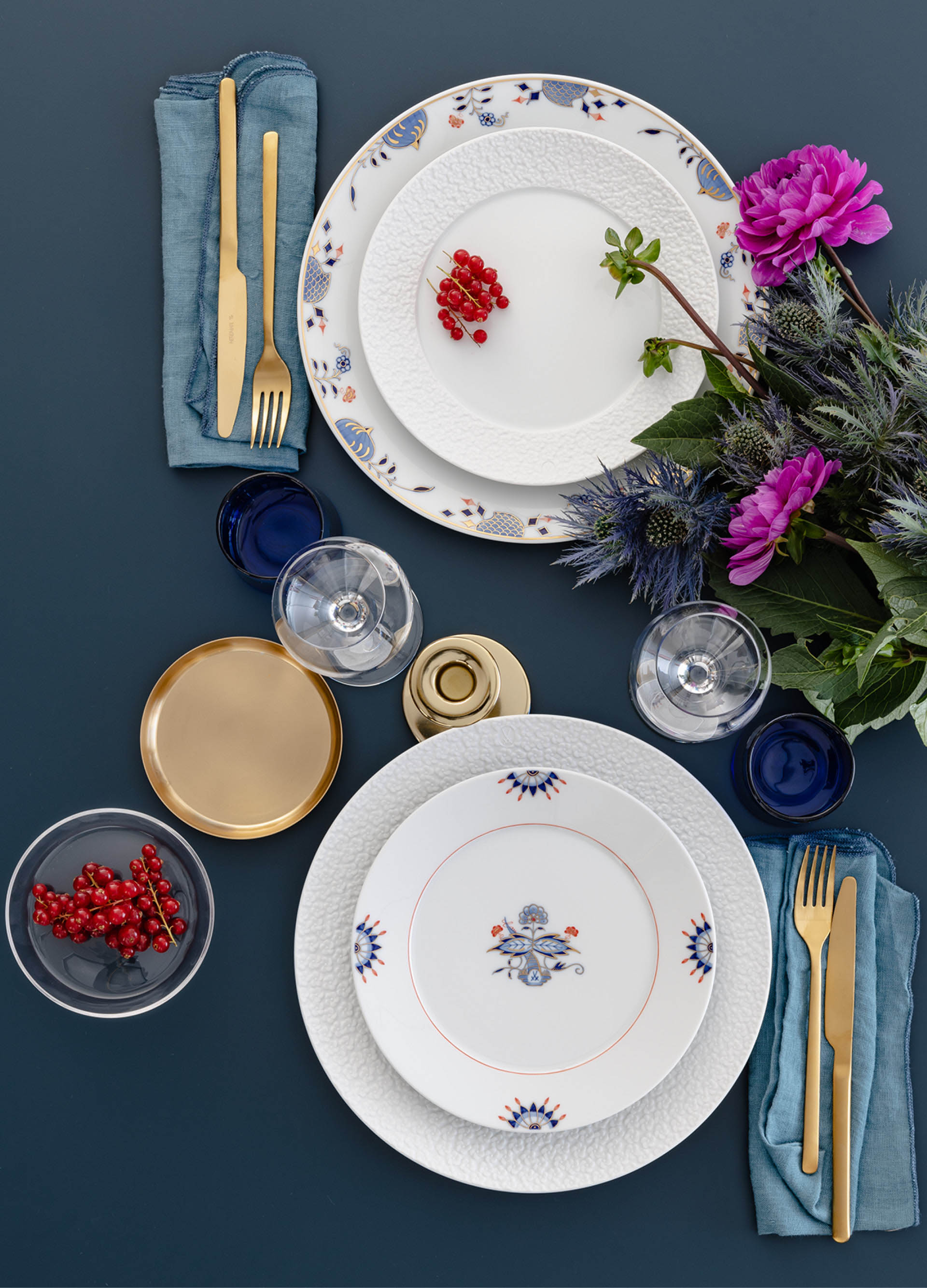 auf der Form N°41Bereits 1731 entsteht das Meissener „Zwiebelmuster“, der erfolgreichste Blaudekor der Porzellangeschichte. Tatsächlich stellt die Malerei auf dem Tellerrand Pfirsich und Melone dar sowie Bambusstock und die zarten Blüten der Chrysantheme in der Mitte. Erstmals in der Geschichte Meissens wird das historische Zwiebelmuster nun auch auf einer weiteren Serviceform umgesetzt. So erhält das berühmte Dekor auf der modernen Form „N°41“ eine völlig neue Bühne und lädt gleichzeitig zum „Mix&Match“ mit anderen Porzellanen ein. Die Opulenz des historischen „Zwiebelmuster“ tritt in Kontrast zu den klaren Linien und der modernen Ästhetik der Form „N°41“ und entfaltet so eine gänzlich neue Strahlkraft.