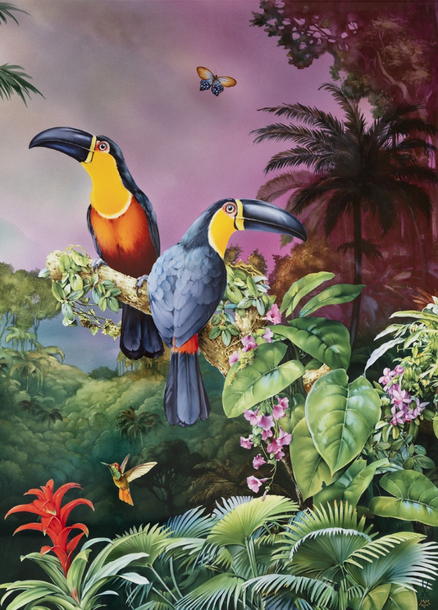 Exclusive collection of Amazon muralsThe impressive murals in our “Exclusive Collection” are an artistic journey into the deep green of the rainforest. MEISSEN designer Lena Hensel combined fascinating motifs from the Brazilian Amazon to create a true masterpiece. In her search, she came across the hyacinth macaw, one of the most iconic symbols of Brazilian biodiversity. Using intense colors, she created the tropical habitat of this fascinating bird in a naturalistic painting style and with various, very elaborate painting techniques. Two large specimens of the hyacinth macaw dominate the scene amidst the countless shades of green of the rainforest, framed by lush palm trees and all kinds of other exotic plants. These intelligent and extremely sociable animals have an impressive ability: they can learn to imitate sounds such as the human voice or the sounds of other animals. -