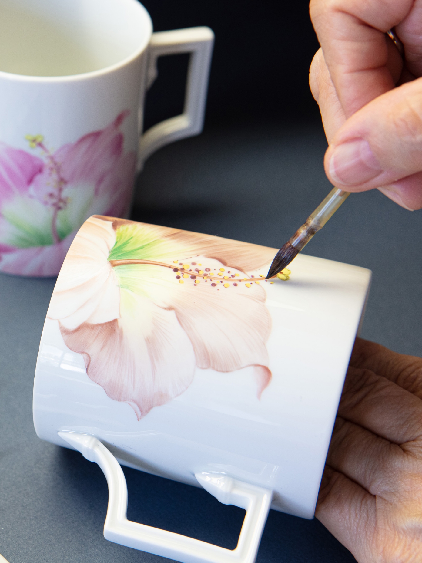The painting on our mugs is differentiated between underglaze and overglaze. Underglaze painting is applied directly to the fired body, whereas onglaze painting is applied to the already glazed porcelain after the second firing. For decors with underglaze painting, such as the "Blue Treasures", the colour cobalt blue is applied to the mug once it has been fired. The colour sinks into the raw body and only develops its luminosity and intensity after glaze firing. This makes the painting technique highly demanding, as it does not allow for any corrections and the painting is given depth with only one colour.