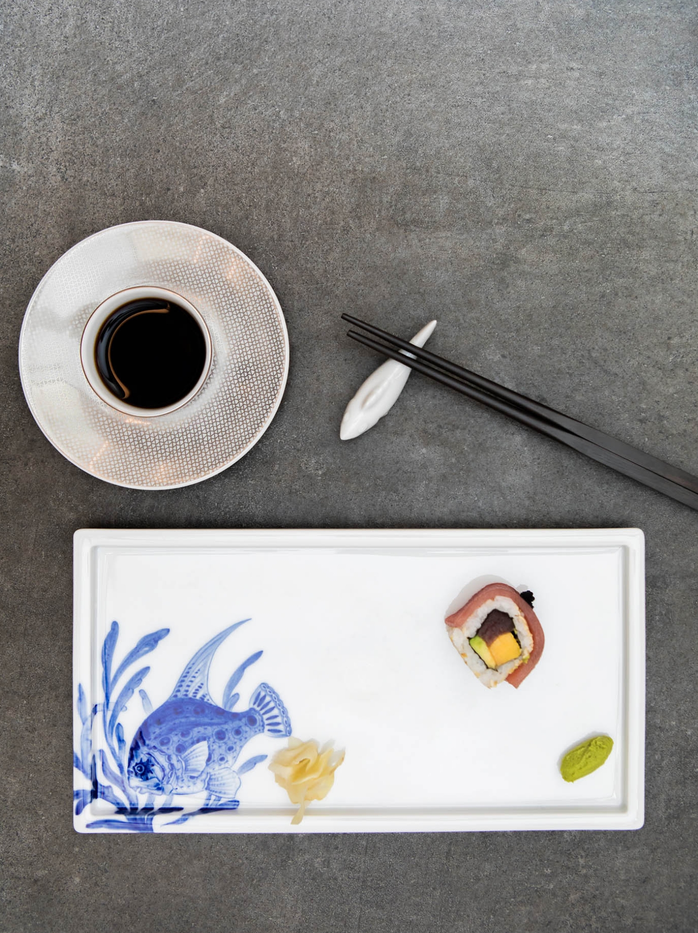 With us, the artfully arranged sushi now meets elegant handmade sushi sets made of Meissen porcelain and thus combines two inventions steeped in history. The sushi sets give you the opportunity to set your sushi in style on high quality sushi plates made of Meissen porcelain. Our sushi sets and sushi plates, as well as our sushi bowls and chopstick trays, can all be combined individually. With their different decors and their modern designs, we have something for everyone. So our “Sushi Set de Luxe” is painted with small delicate sea creatures and the “Meissen Cosmopolitan Blue Treasures” sushi platter is adorned with a large fish painted in underglaze blue. But also our chopstick trays in the shape of a fish fit perfectly to a balanced sushi evening. Our sushi sets are also the perfect gift idea for any sushi and fish lover. Enjoy your sushi at home as in the extravagant sushi restaurant and make yourself an unforgettable evening - whether at an elegantly set table or during a cozy TV evening.