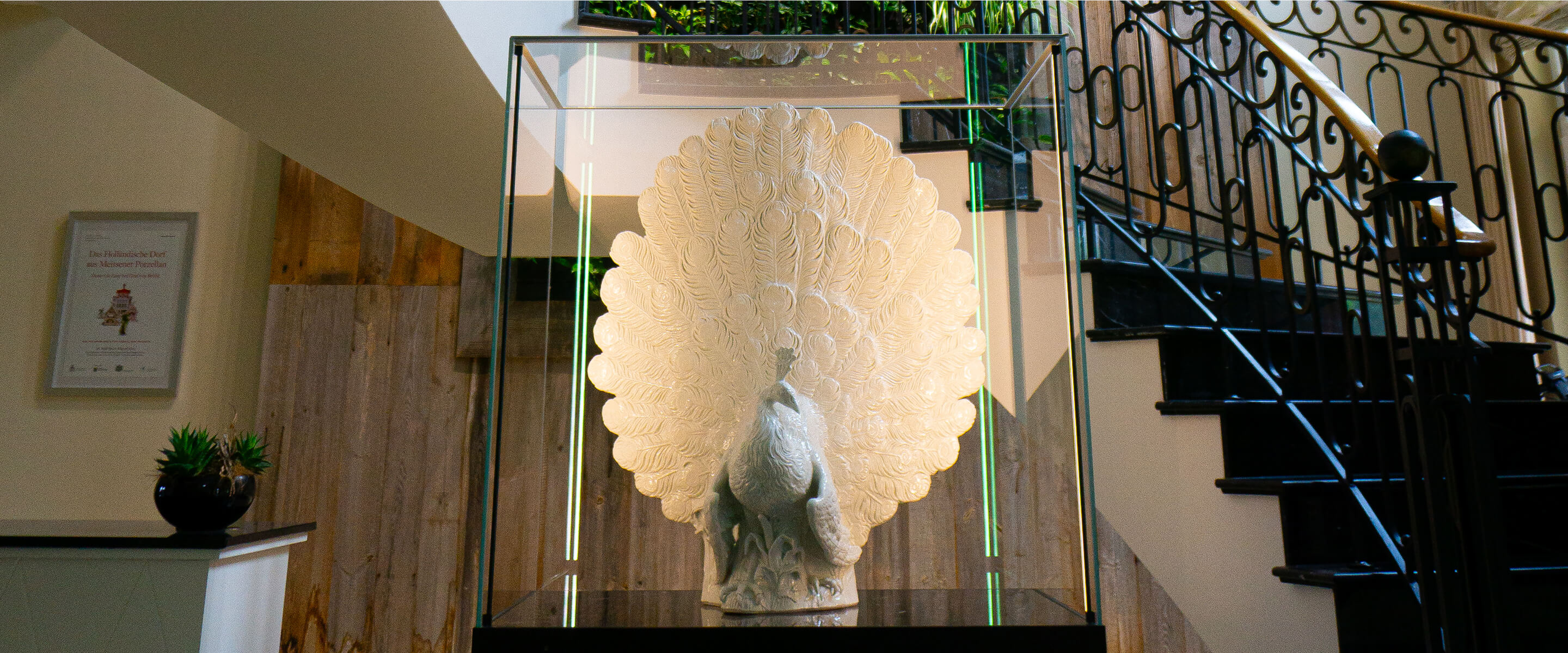 When it comes to impressively integrating porcelain in large sizes into the interior design, the Naturresort & Spa Schindelbruch in the southern Harz region is a real role model. The MEISSEN hospitality concept focuses on the idea of showing enthusiasm for the beautiful, the valuable and the joy of the extraordinary and combining cultural assets, art, craftsmanship and lifestyle in a unique way. Here you can discover, among other things, impressive large porcelain sculptures from Kaendler's "Menagerie of Animals" from the early 18th century, which enrich the interior in a magnificent way. In the resort's rooms, large, ultra-modern wall installations made of "white gold" create an "oversized“ look that is sure to amaze.