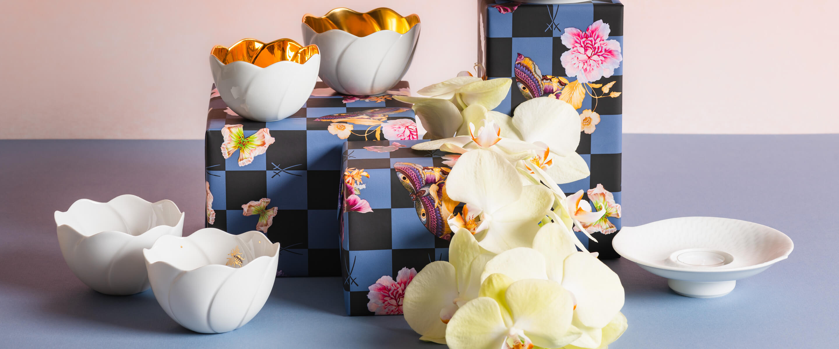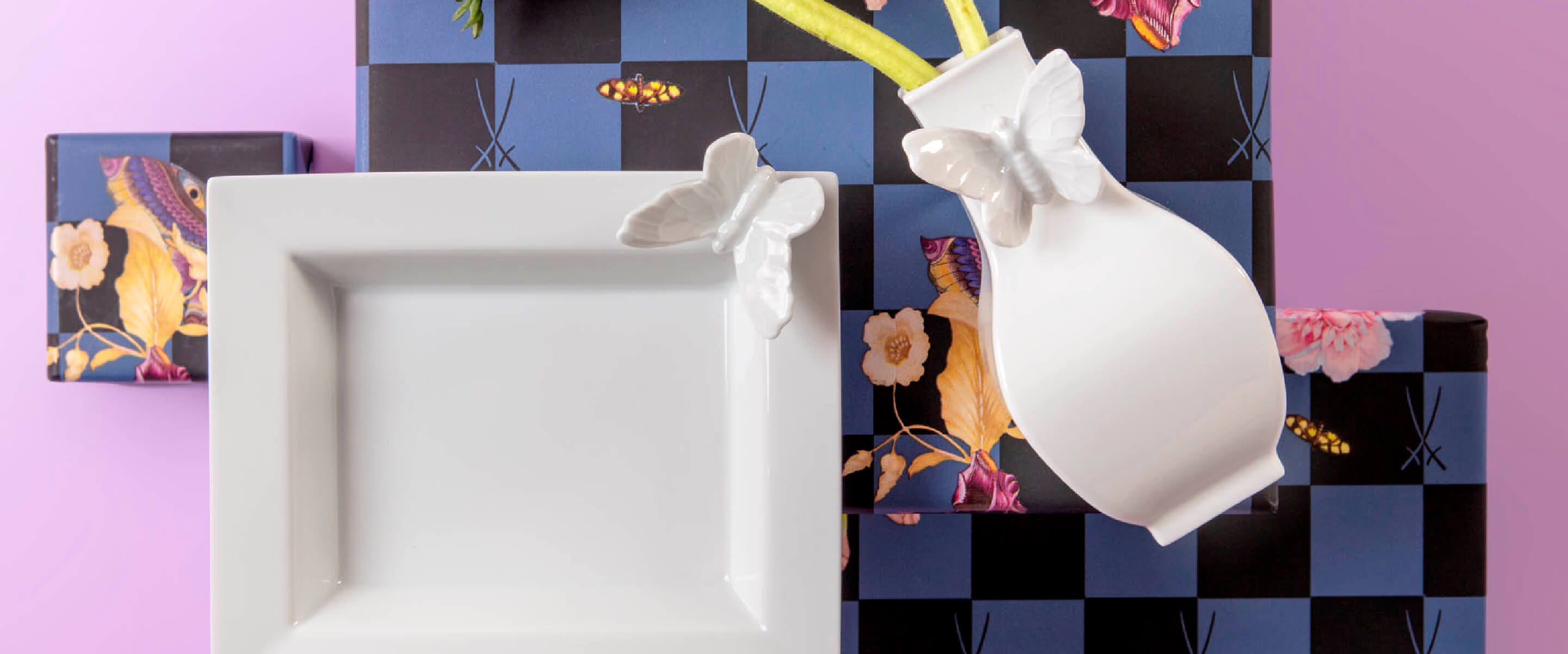There's no place like home. And so small gifts that can transform the home into a true oasis of well-being can become long-lasting sources of joy. Porcelain vases, such as the "Butterfly Collection" vase or the "Landscape" vase, not only provide the perfect stage for colorful flower arrangements of all kinds, but also radiate genuine joie de vivre and elegance in their modern, exciting form. Create a cozy and harmonious atmosphere with candle accessories such as the "Waves Relief Storm Light" or the "Water Lily Relief Dish". Only the "Royal Blossom Lantern" with the iconic MEISSEN "Snowball Blossoms" exudes even more elegance and tradition.