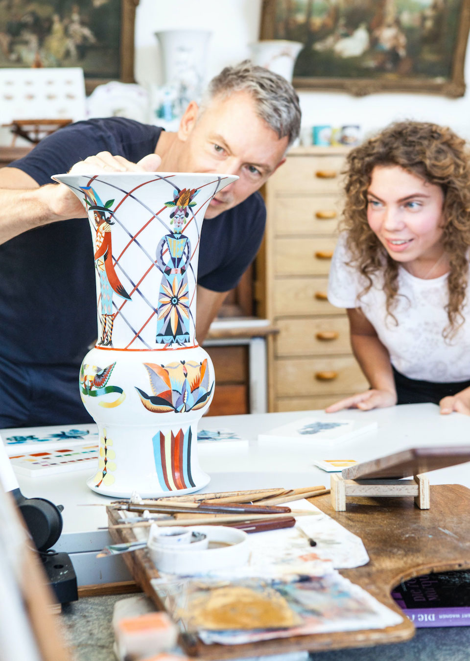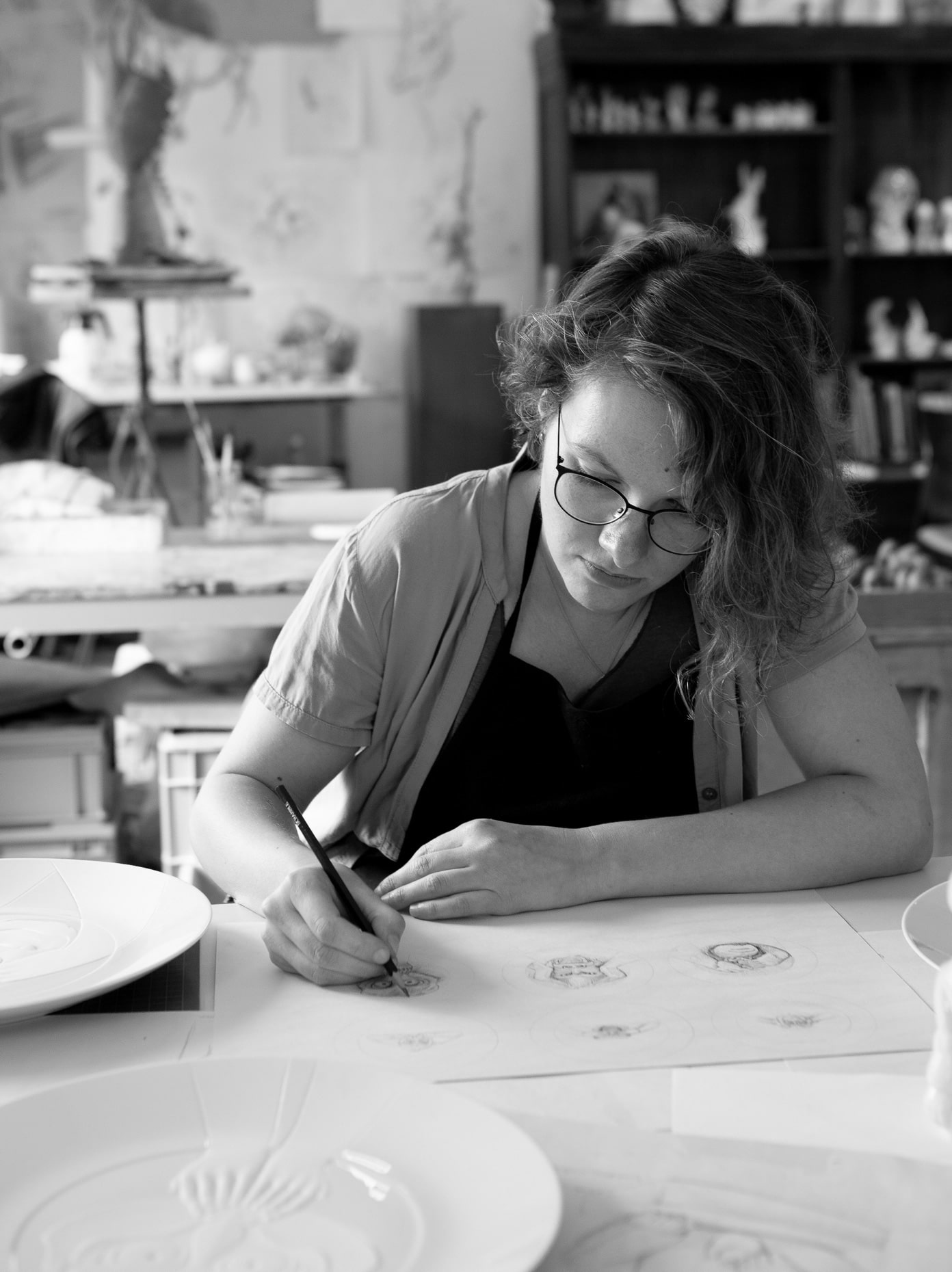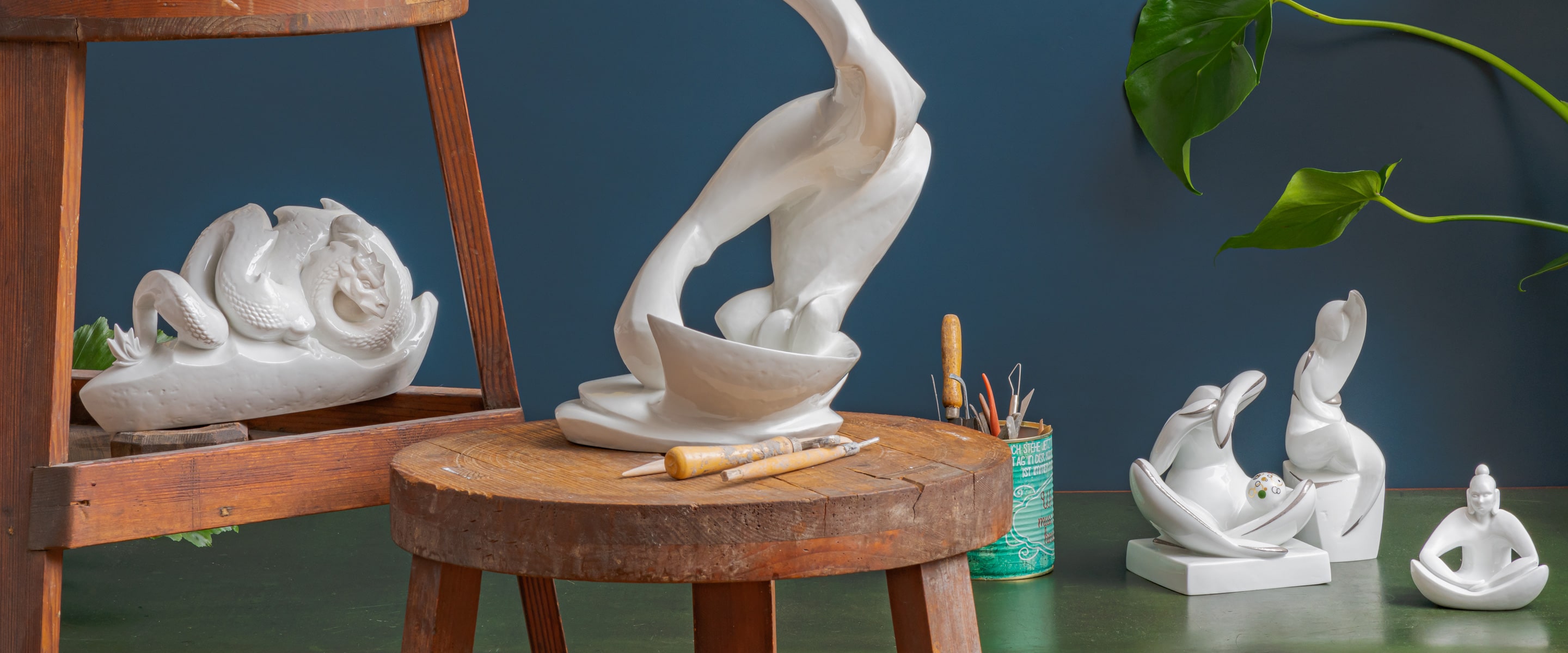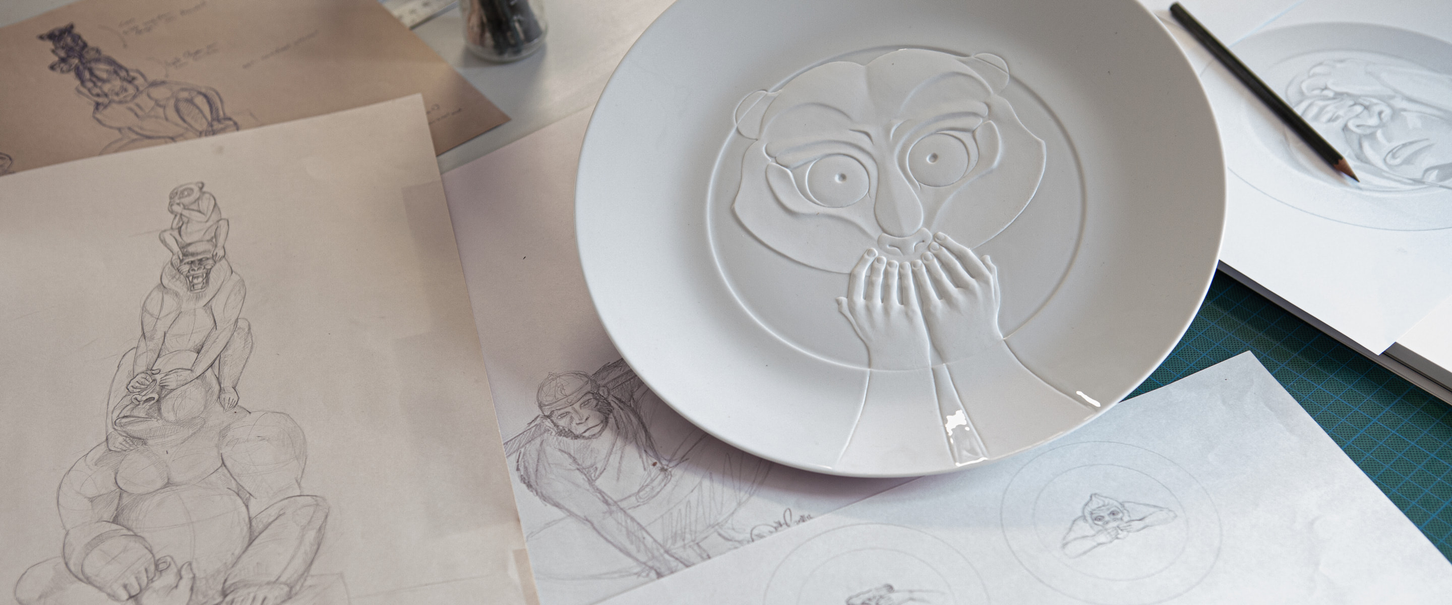 Her creative process usually begins with extensive research and initial sketches on paper or even sometimes on the computer. Delving into new worlds again and again, she develops the initial ideas for her artwork from this process. In a first step, her creative ideas are given form with modelling mass or as an initial model made from clay or plaster. Her sketches serve as an initial idea and a snapshot pointing the way ahead. Within this exciting process, her ideas continuously evolve as they are reflected in sculptural form. Imparting her work with its distinctive character and working out the fine details are the most beautiful part of her work, says Maria Walther. This is also the case with her "3 Monkeys" figurine, which now delights collectors and lovers of Meissen porcelain both in its hand-painted decorative variant and in pure white. Her artistic exploration has also produced various bottle stoppers and limited-edition wall plates that have added to Meissen’s repertoire of fine porcelain.