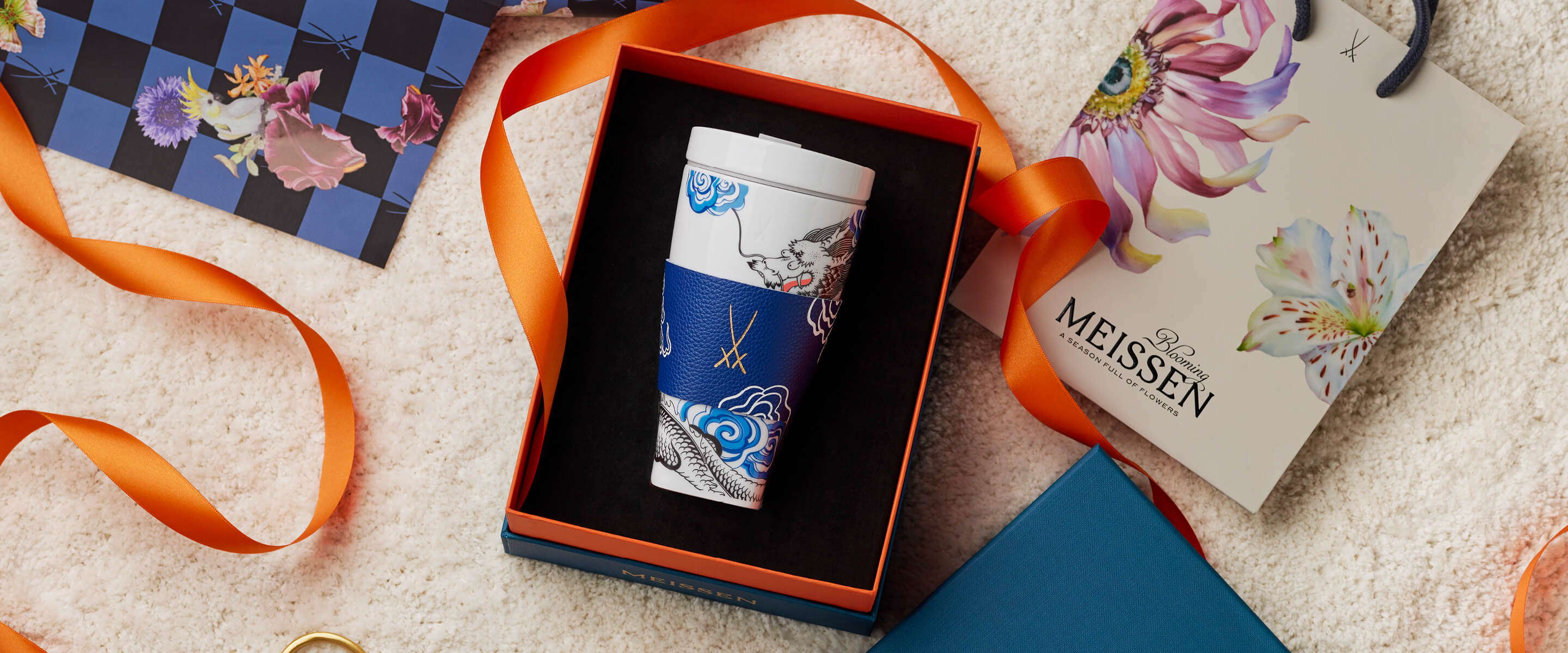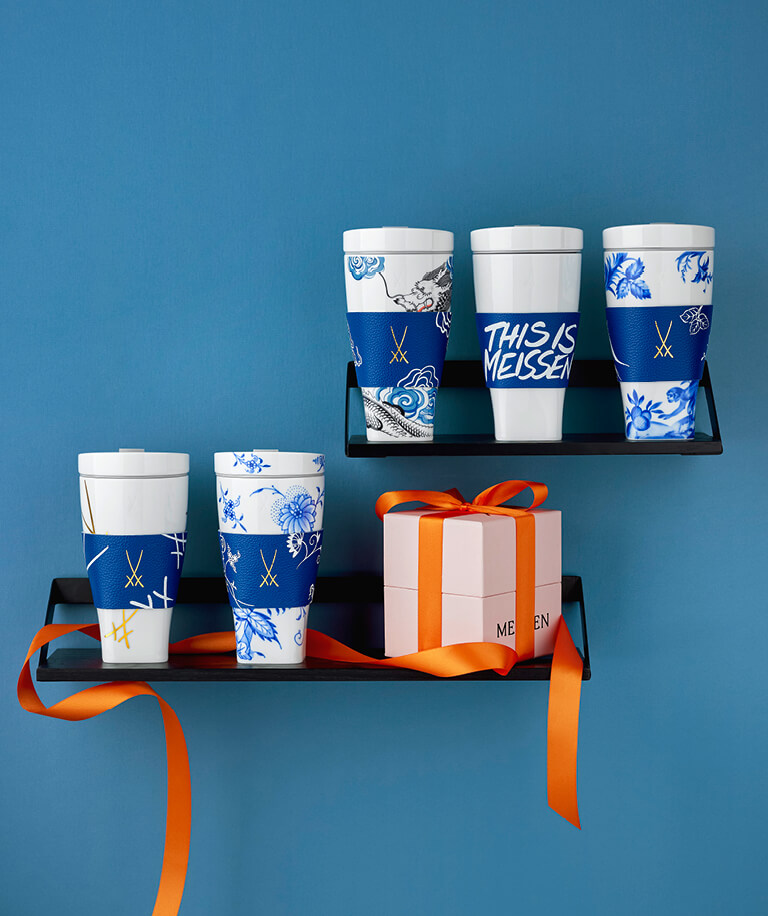 One of the first designs that the product designer had in mind for the coffee-to-go mug was the "Monkey & Sloth" motif. A remarkable piece from MEISSEN's history served as a source of inspiration - a vase on which the animals are depicted in blue underglaze. The scene in which the animals hang from the trees evoked associations of exhaustion, tiredness and the urgent need for coffee for product designer Hou. Other iconic designs followed, such as the Blue Onion Pattern in classic blue or the Crossed Swords in gold. To mark the upcoming Year of the Dragon, a variant with the Fortune Dragon designed by Hou was also planned.