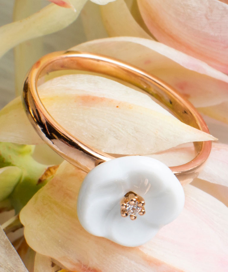 The perfect round shape of the porcelain pearls is the result of an absolutely precise work. This applies not only to the spherical shape of the little treasures themselves, but also to their painting. Each pearl is coated with so-called luster paint, which imitates the shimmering effect of natural pearls in a unique way. Luster colours are among the oldest colour formulas in the manufactory and have been used on magnificent vases and paintings in MEISSEN since the 18th century. In the final firing, they create iridescent metal oxide layers that reflect the light like mother-of-pearl. This not only gives the Meissen porcelain pearls an appearance that looks deceptively similar to natural pearls. The soft sheen also reminds us of the silvery shimmering moon and thus of the universe. In accordance with this idea, the porcelain pearls of the "Pearl Collection" on the choker, bangle and the "Circle" ring circle on a kind of orbit made of 750 rose gold.