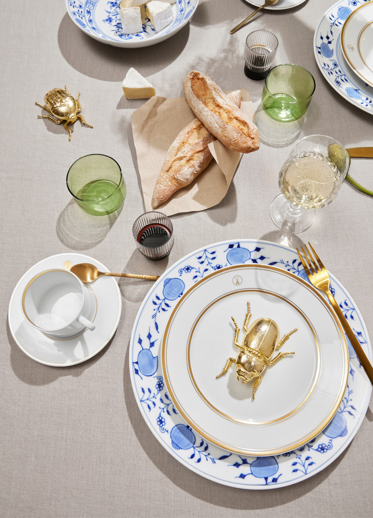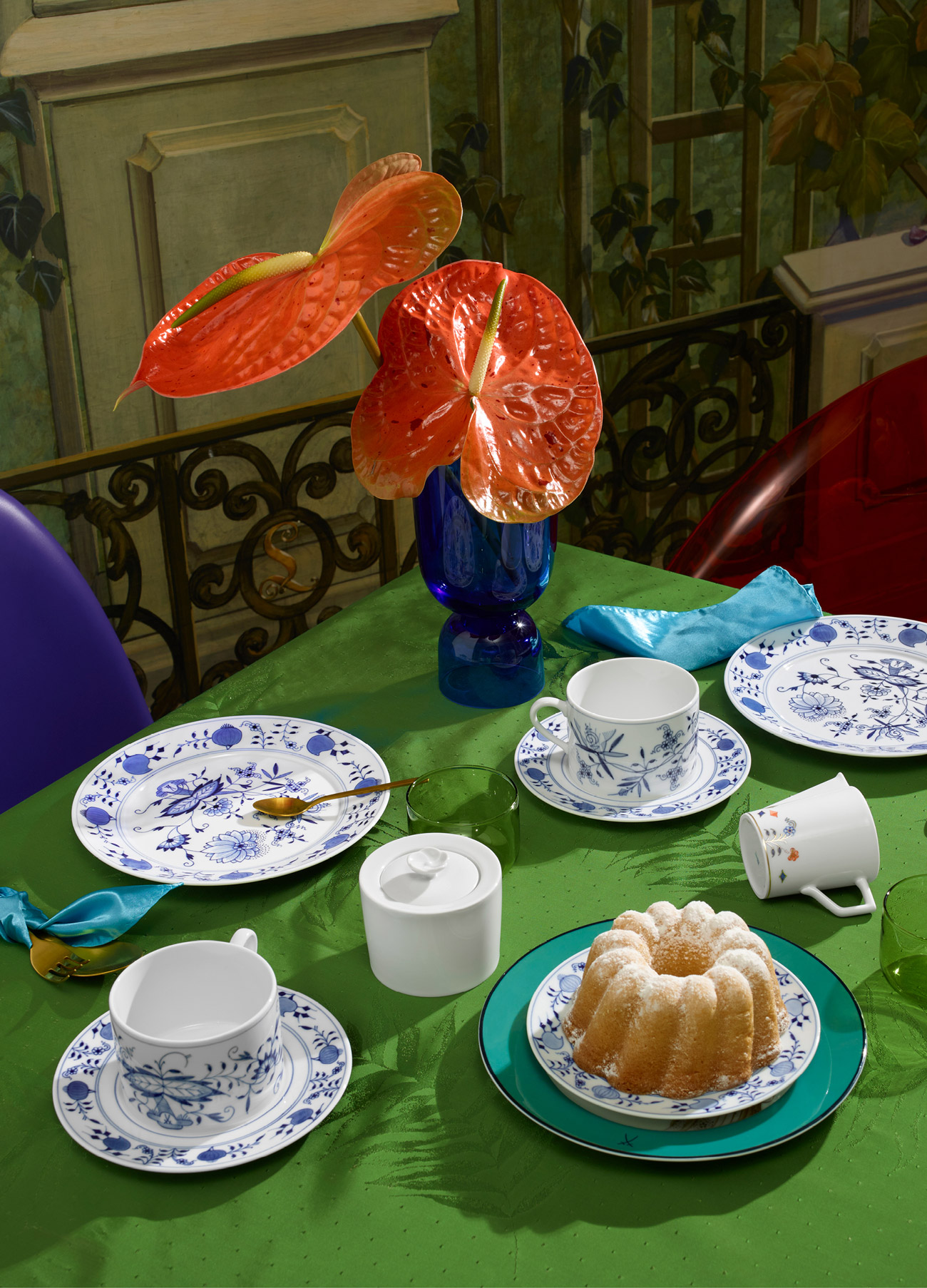 Noble Blue“Noble Blue” revisits one of Meissen’s most famous decorative motifs: the iconic “Onion Patter” from 1731. Inspired by the Eastern Asian porcelains of its time, the “onions” in the pattern are not in fact onions, but rather exotic fruits and blossoms, each with their own assigned placement within the decor. In “Noble Blue” these opulent compositions are pruned and rearranged in a light-hearted, contemporary design, giving the sleek “N°41” tableware series a decorative nod from the past.