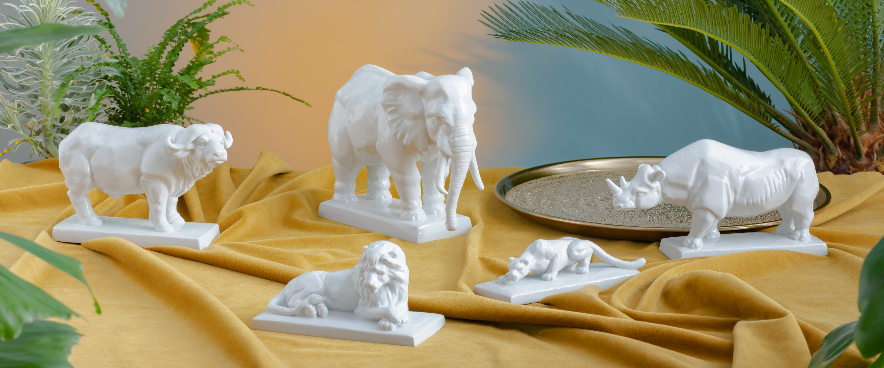 Experience the breath-taking biodiversity of the savannah with the figurine group "Big Five" by sculptor Maximilian Hagstotz, who presents buffalo, elephant, rhinoceros, leopard and lion for the first time in a unified figural group. Maximilian drew inspiration for his work not only from the animal world, but also from traditional African styles and patterns. The naturalistic representation of the figurines is complemented by a discreetly angular form in the style of African woodcarving sculptures. The elaborately hand-applied staffage also finds inspiration in this traditional art form and also brings out the brilliant white of the porcelain even more prominently.