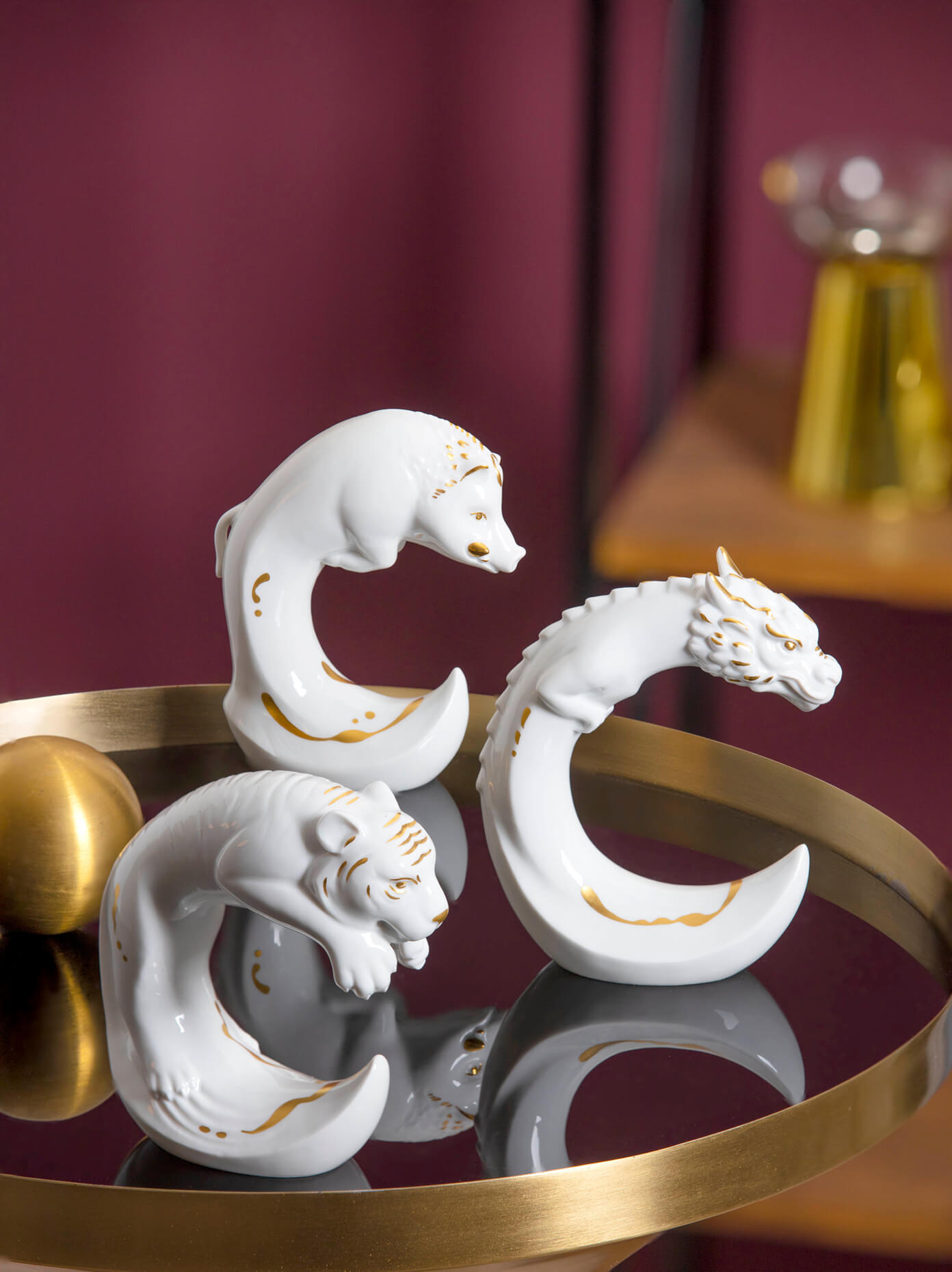 The artistic interpretation of the Chinese zodiac signs in Maria Walther's collection of the same name gives the majestic animals a lively presence. Each figure describes the legend of the great race that was declared by the Jade Emperor throughout the animal kingdom. The twelve animals that reached the finish line first were to be immortalized in the Chinese horoscope. The mighty dragon was expected to reach the other shore first, but on its way it passed a village that was suffering from a severe drought. So the dragon lingered in the village to let it rain before continuing on its way - eventually finishing fifth. The powerful movement of the dragon is captured by the dynamic lines and lively expression of the porcelain. The dragon, whether in pure white or decorated with fine golden details, appears almost alive, ready to enter the world and leave its legacy.