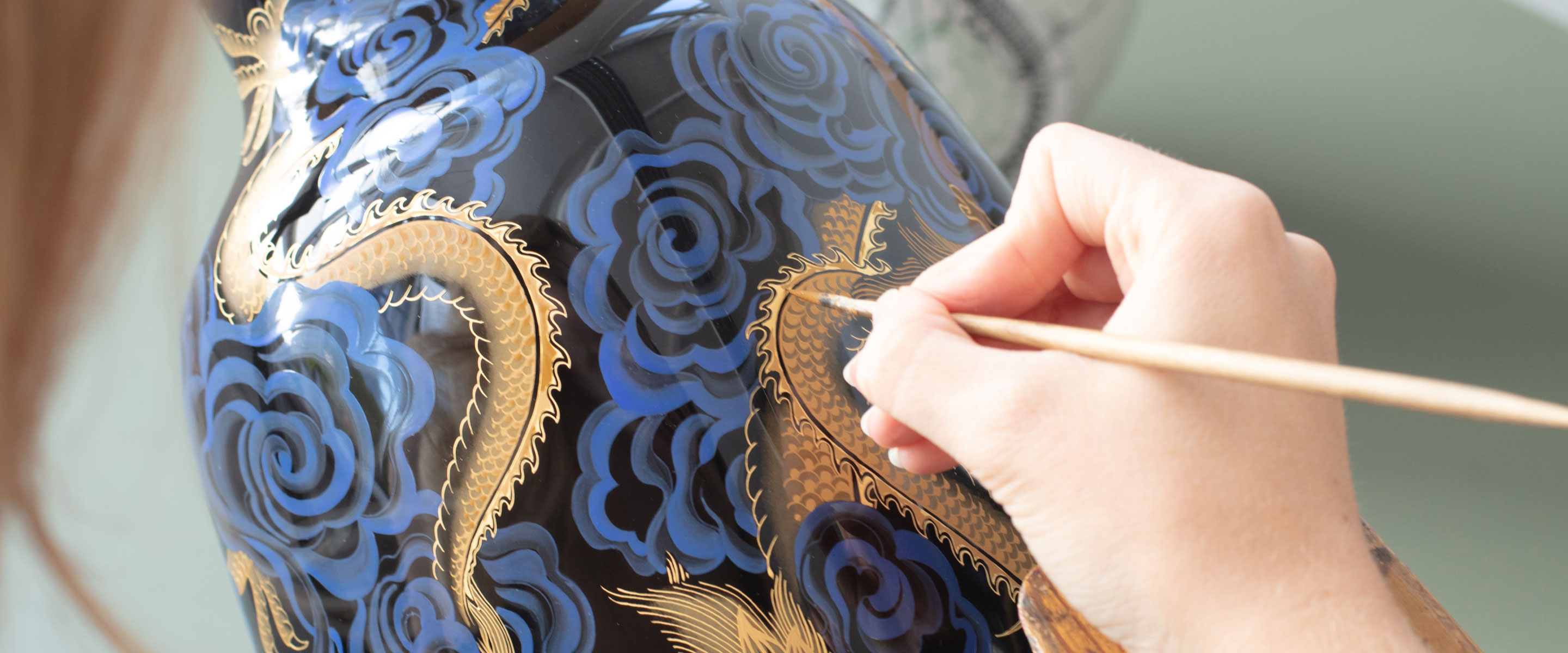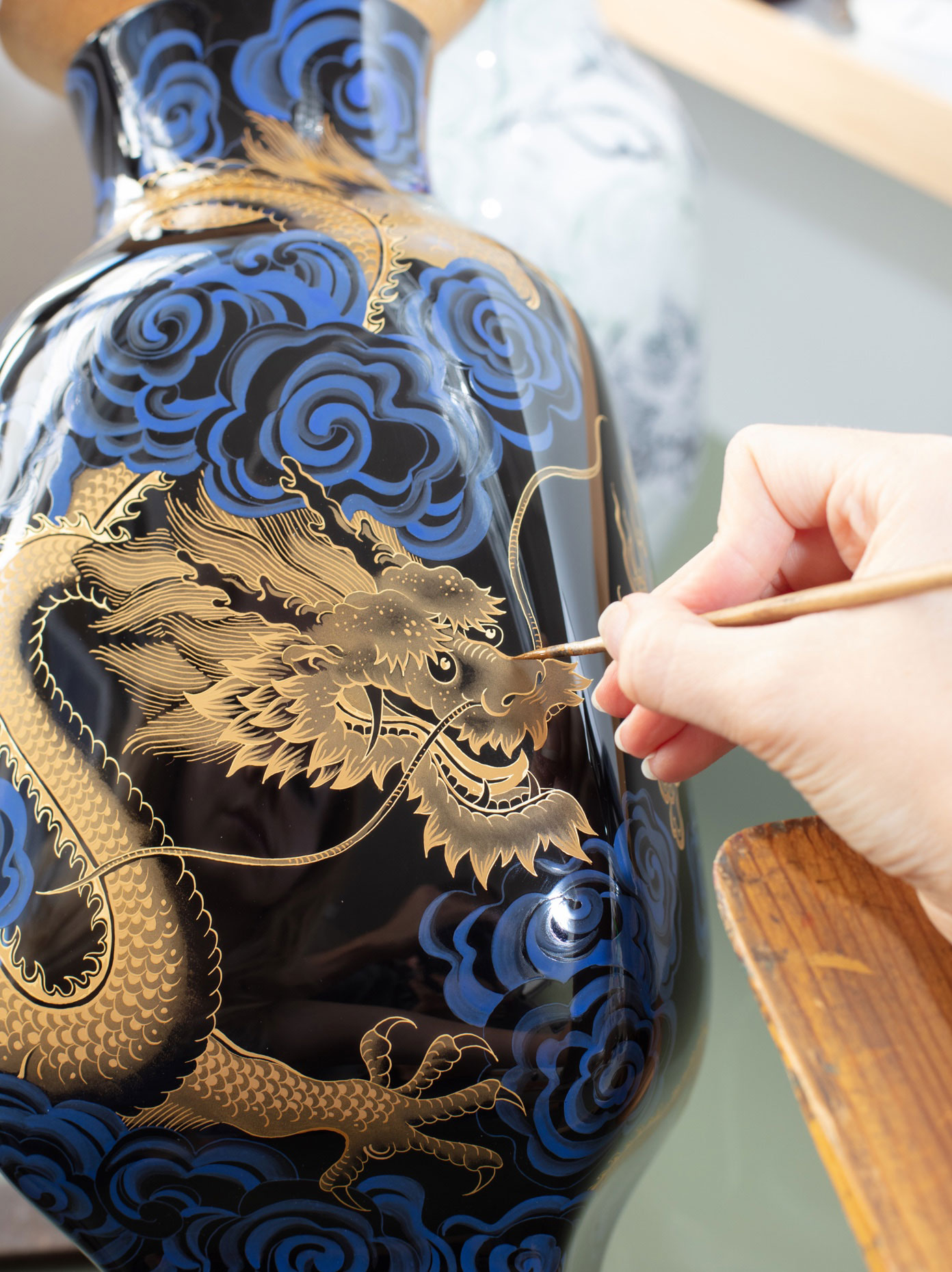 Connected inseparably with all depictions of dragons is the image of the so-called “dragon pearl“. It is considered to be the source of power and immortality. Accordingly, we also meet her on the “Nova Vase“: Two golden Fortune Dragons are romping in the clouds, surrounding the flaming sphere. The clouds are applied with the so-called “Limoges painting“. Layer by layer, the paint is applied to the black vase body. Depending on the number of layers, parts of the painting appear almost transparent, giving them a special spacial depth. MEISSEN is the only manufactory in the world that still practices the art of Limoges painting today!