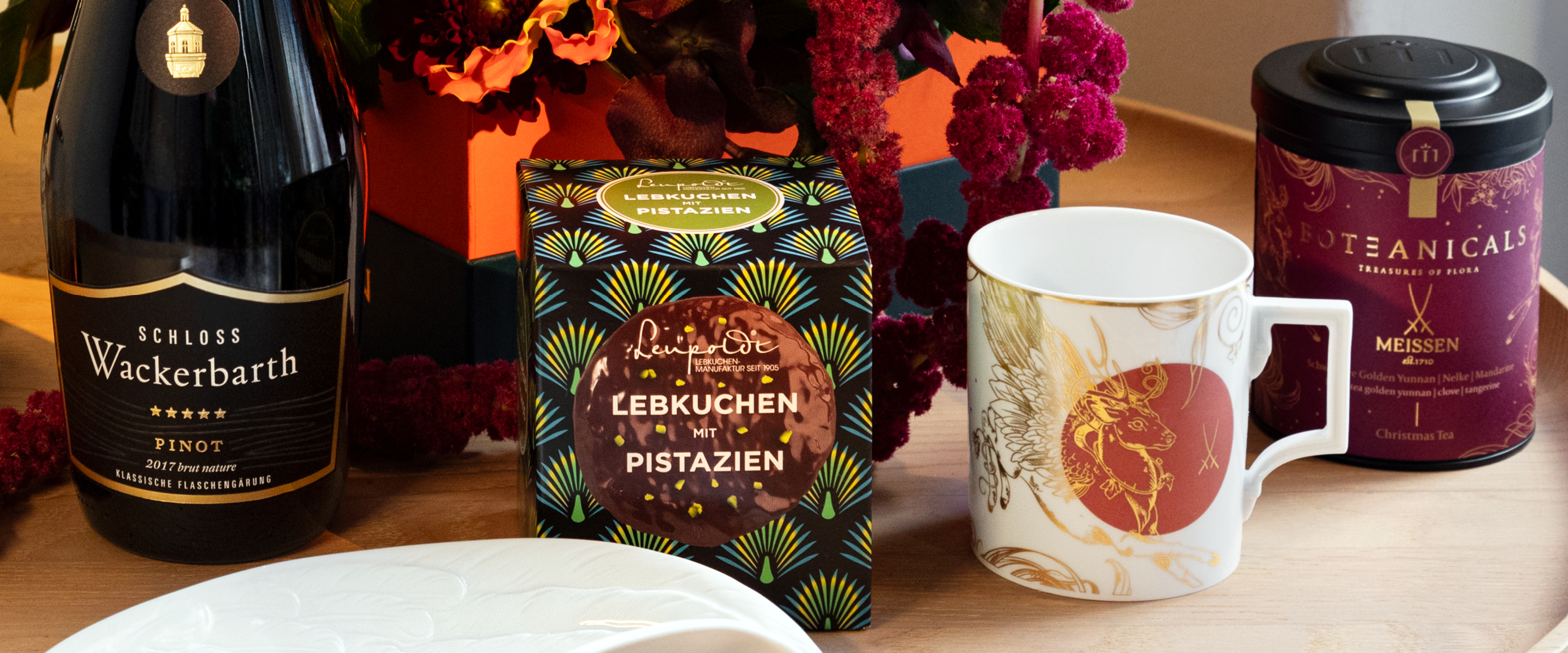 Speculoos and Gingerbread: These pastries are undoubtedly stars of the Christmas season. Speculoos, rich in spices like cloves, cinnamon, and nutmeg, and gingerbread, which is also distinguished by its honey flavor, are culinary mainstays. A visit to the LEUPOLDT® gingerbread manufacturer reveals how traditional baking can be enhanced with modern accents. In our 2-piece gourmet set, classic gingerbread is presented in a modern way with a fine pistachio note in a MEISSEN winged bowl - an exquisite fusion of craftsmanship and tradition.