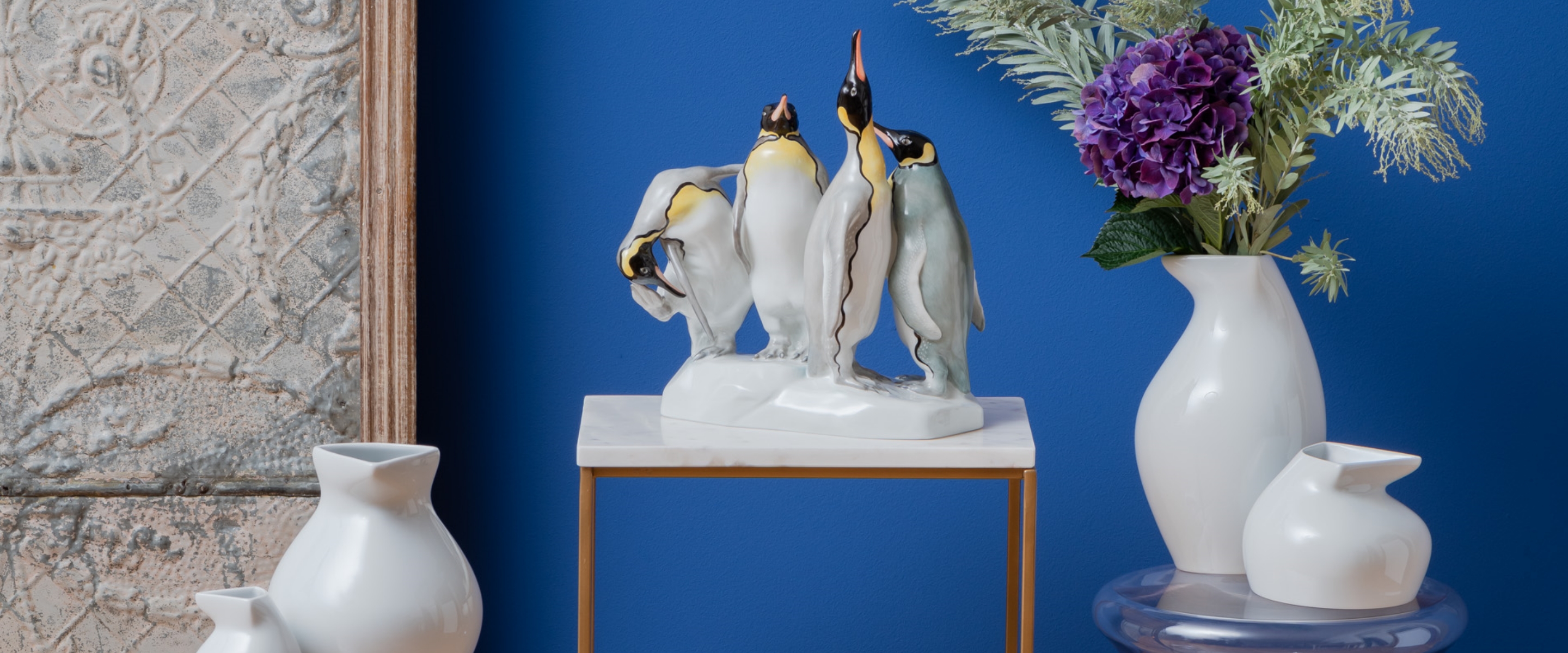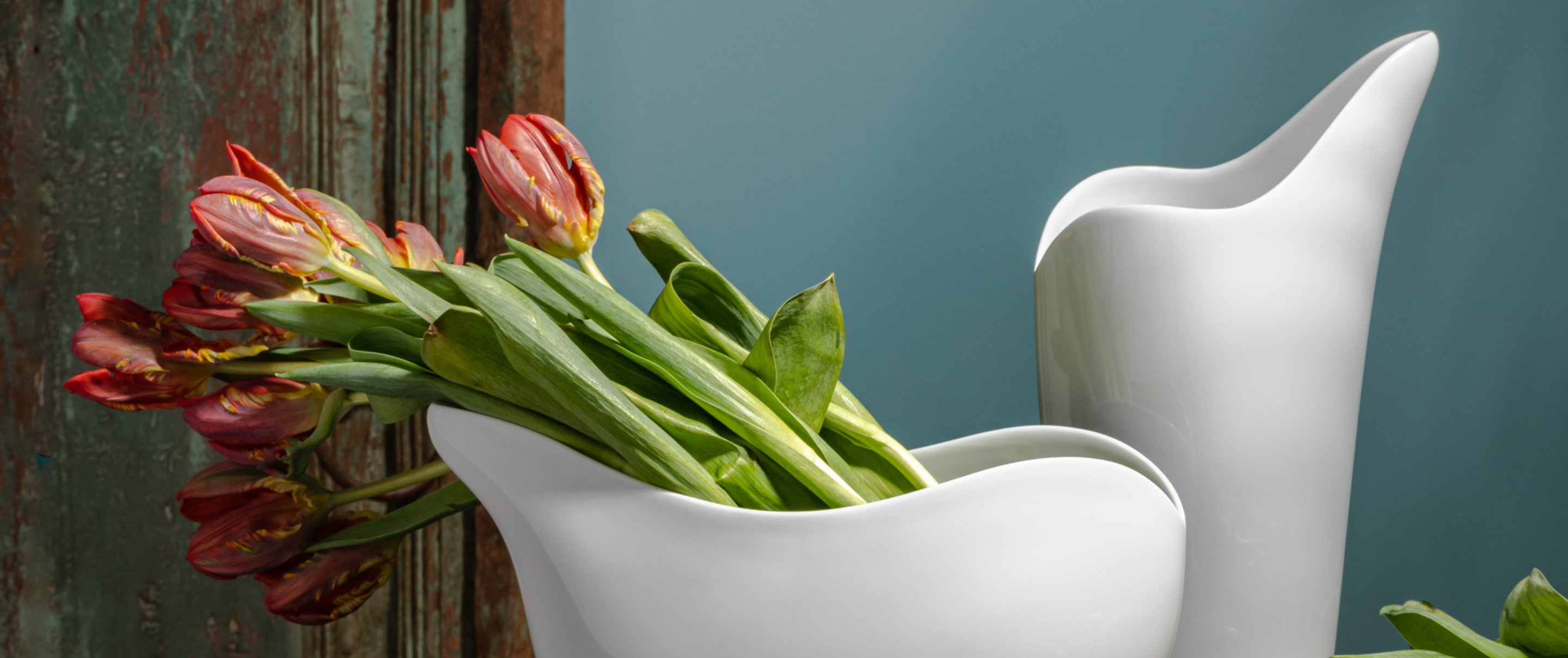 One of Zhuoyu Hou's first projects for MEISSEN was the "Antarctica" collection, which was inspired by an arctic ice landscape and a family of penguins. The form-giving dynamic curves contrast with the angular openings and visualises the belly and head of the penguins. The different sizes represent the members of the penguin family - mum, dad, a older brother and a baby. The size variations allow a versatile use in everyday life, as individual pieces or as an arrangement of different objects of the series. Inspired by the ice landscape, the designer also developed various bowls, candle sticks and mugs. Zhuoyu Hou uses the vases not only for flowers, but also as water carafe or milk can and the bowls for fruit or snacks.