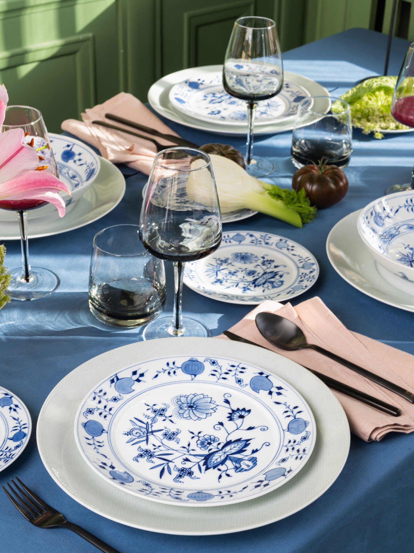 The “Onion Pattern” was first applied to the “N°41” form in 2017 as “Noble Blue,” a reinterpretation of the historic décor that counters the opulence of the original with a modern lightness. In “Noble Blue,” the core elements of the original are taken up and rearranged, with added details in luminous red and filigree gold accents that frame and accentuate the blue to create radiant contrasts. The two décors can now be superbly combined with one another, mix & match style. The purist “N°41” form also combines seamlessly with other contemporary service forms such as the „MEISSEN Cosmopolitan“ series with its mesh décor variants, including platinum and the new mesh blue and mesh green colours. Thanks to the underglaze, all pieces in the “Onion Pattern” collection on “N°41” are dishwasher and microwave safe.