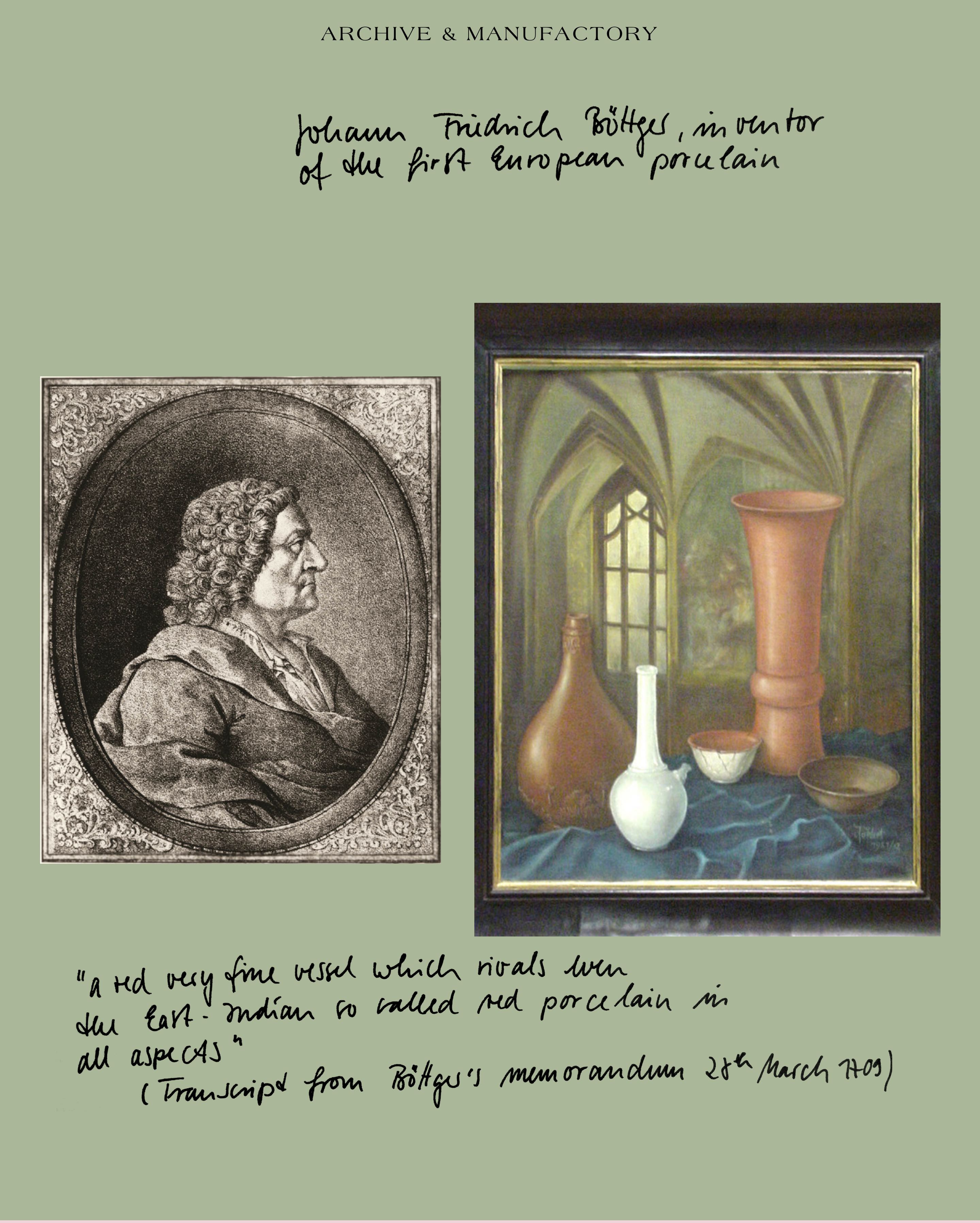 Johann Friedrich BöttgerJohann Friedrich Boettger ranks as one of the major pioneers in European porcelain and the founding of the Meissen manufactory. As a young alchemist in 1702, Boettger was ordered by Augustus the Strong to Dresden, as his reputation for knowing the secret of creating gold had spread. Though years of attempts failed to reveal the philosopher’s stone, Boettger’s stoneware invention – clay combined with quartz and a flux material then fired at high temperatures – marked the first time China’s secret formula for porcelain manufacture had been successfully cracked in Europe. The invention of white hard-paste porcelain followed a few years later, with a formula that is safeguarded in the manufactory archives to this day. The Boettger legacy still reverberates not only in the Meissen manufactory, of which he was the first director, but also in the fitting nickname for porcelain: “White Gold.”